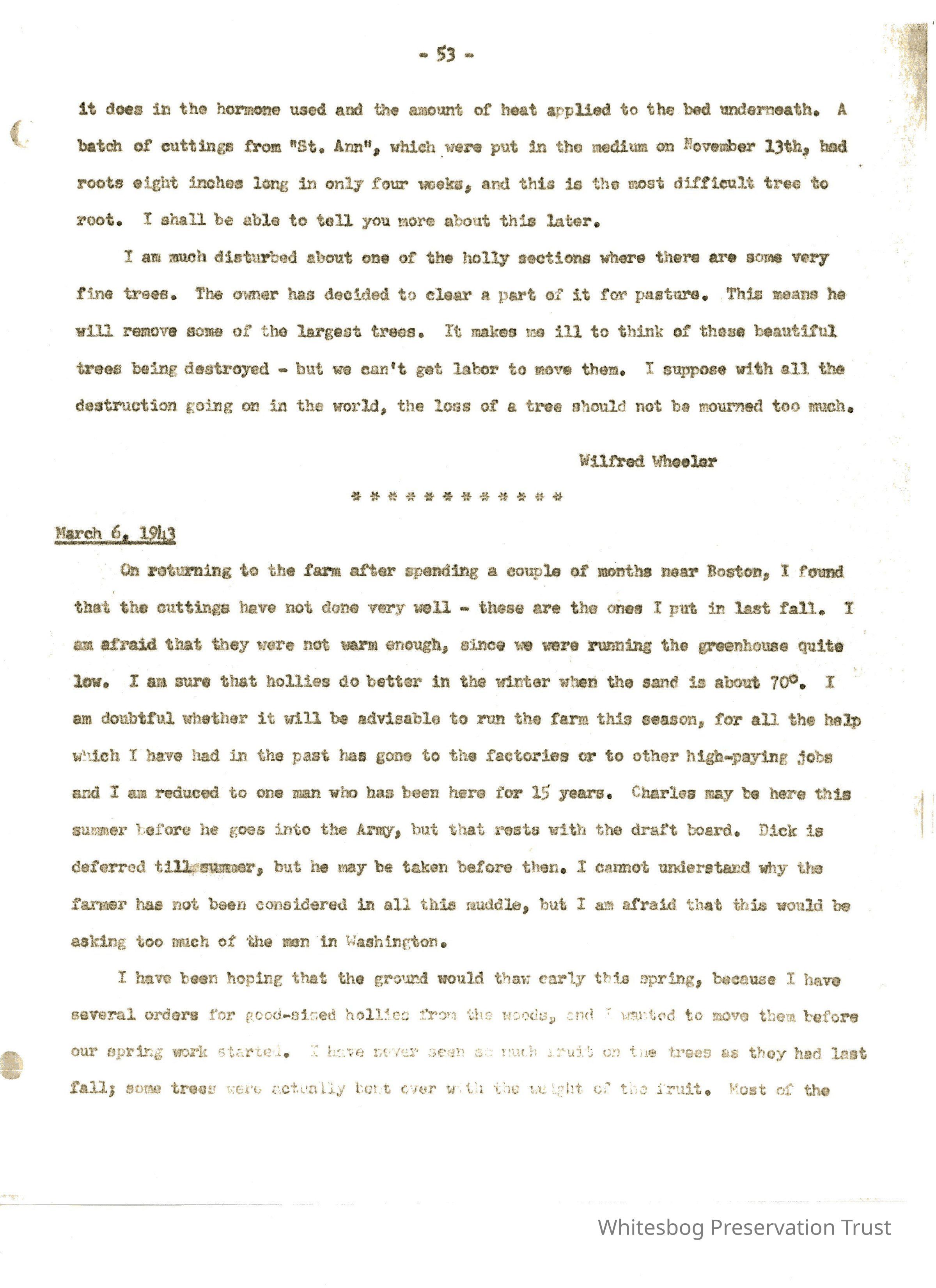 Wheeler remarks on the cold winter and that it is still very cold in March. They have been away from the farm for a couple of months during which time he worked for a large green house doing propagating. Back at the farm, hollies in green house had not done well--heat too low. Complains of lack of labor, factories pay better, etc. Will send small holly orders he has to Eliz., has an inquiry for trees for hedge--suggests Clark but asks Elizabeth about Osa. Complains of army (Fort Edwards) over running/destroying the land. He is closer to Edwards than Elizabeth is to Dix. Complains about confusion in drafting levels for his sons. Hasn't been able to see how hollies have wintered in the woods.Collection