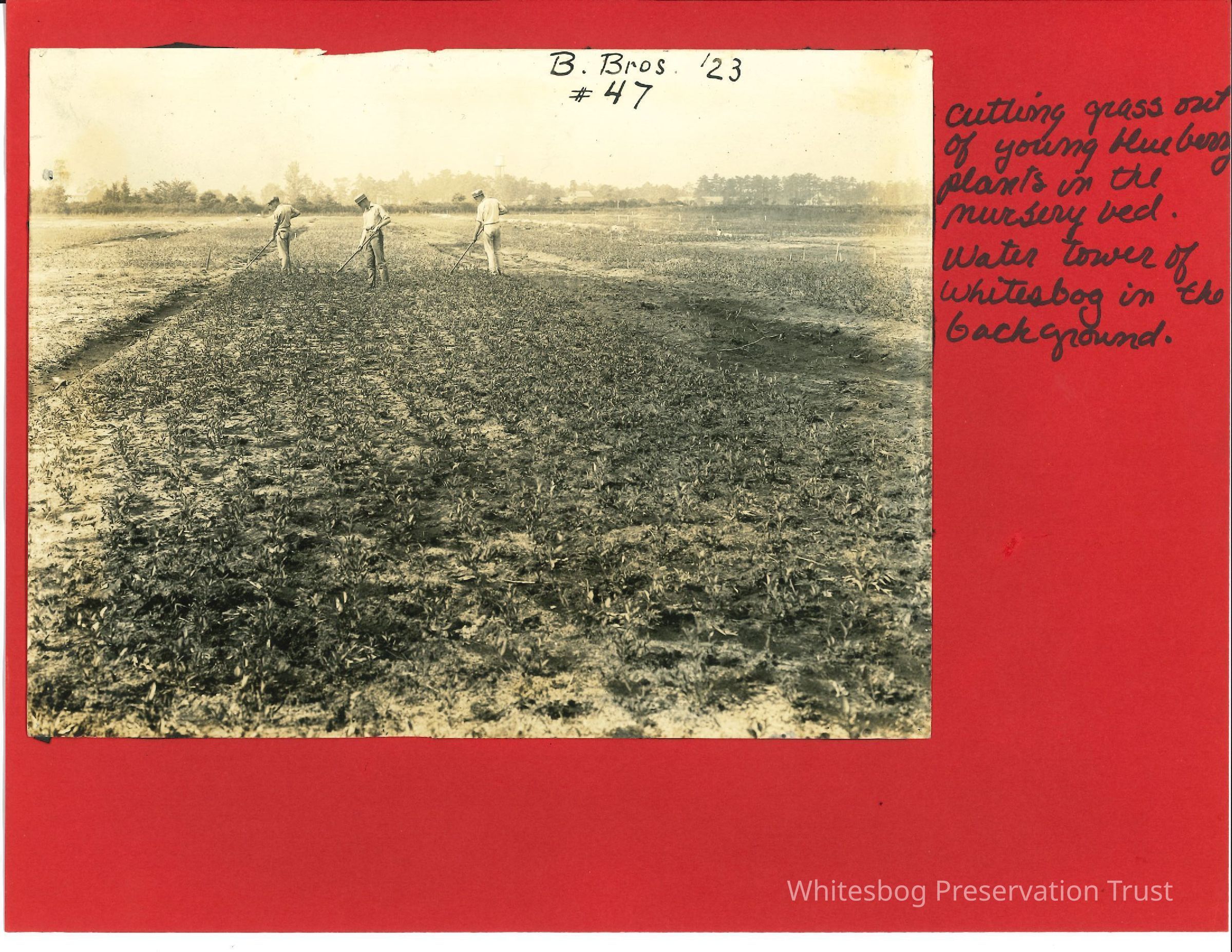 Cutting grass out of young blueberry plants in the nursery bed. Water tower of Whitesbog in background along with village buildings.