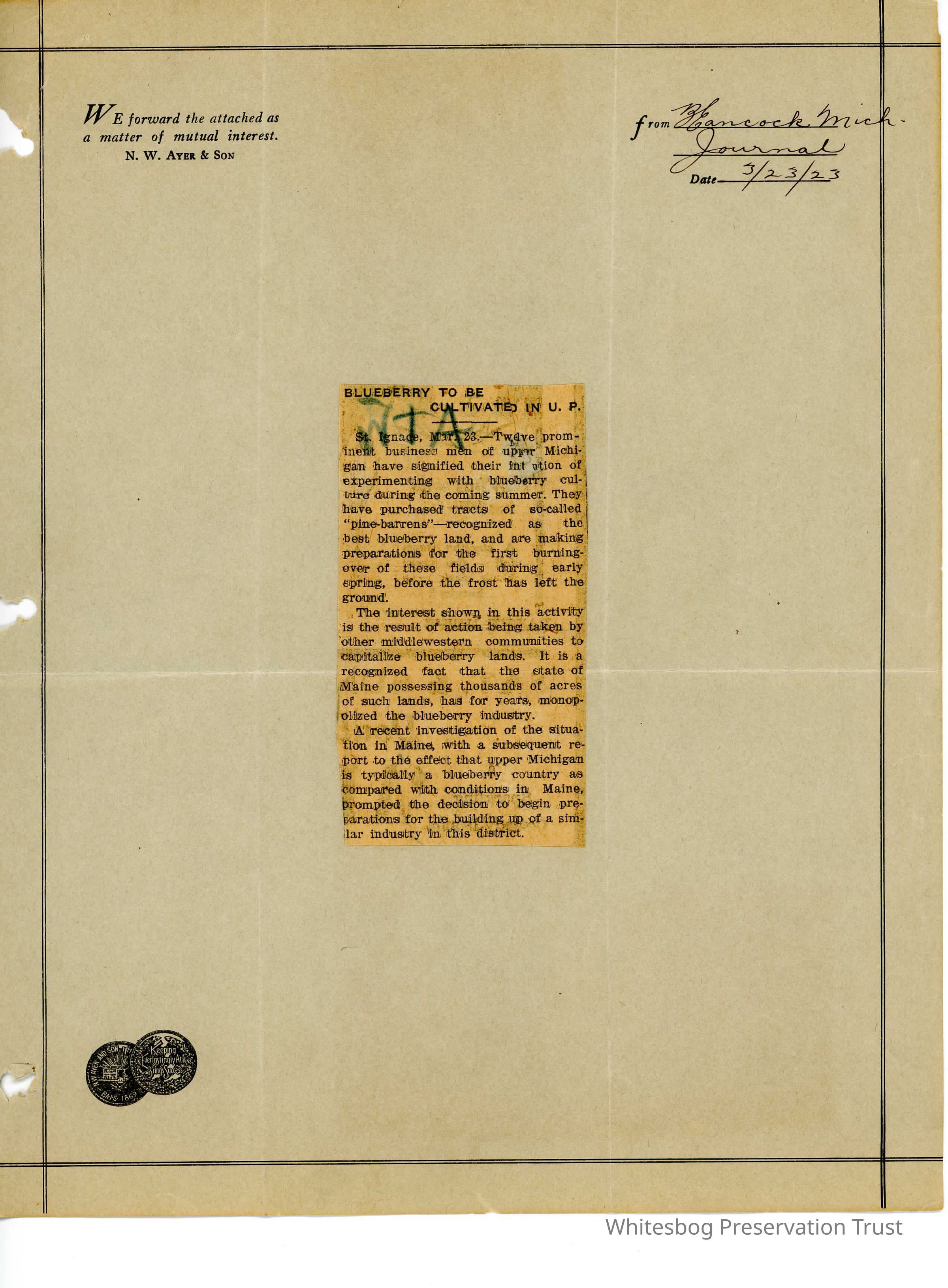 Michigan business men plan to build up the blueberry in upper Michigan