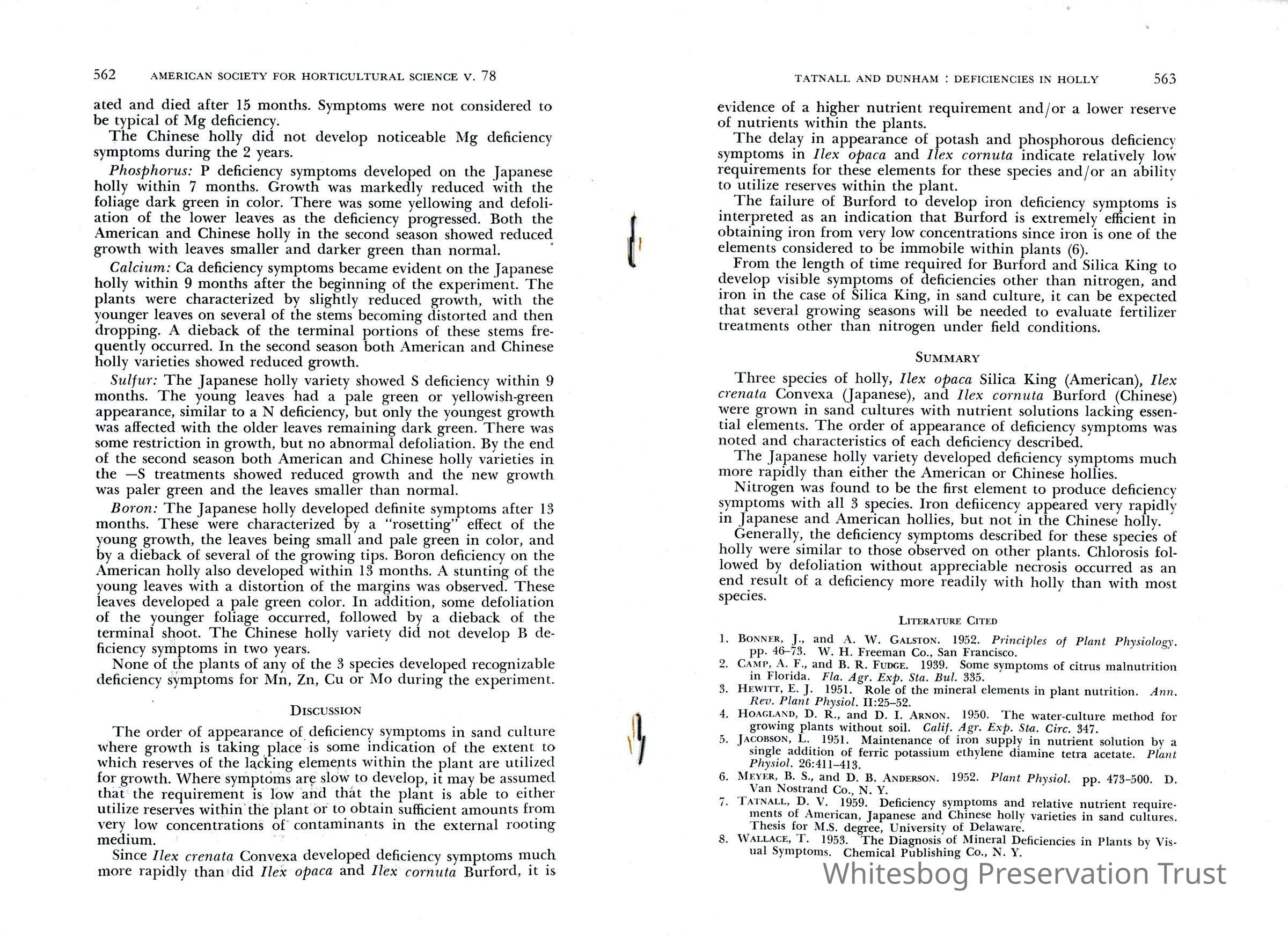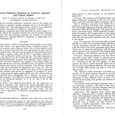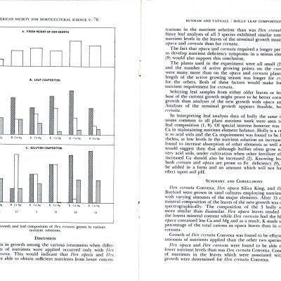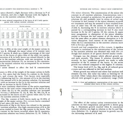 A study was done on the leaves of three holly species grown in sand cultures. The purpose was to determine the composition of the leaves' mineral content and the effects of the sand nutrients as a means of analysis when nutritional problems were encountered.Collection