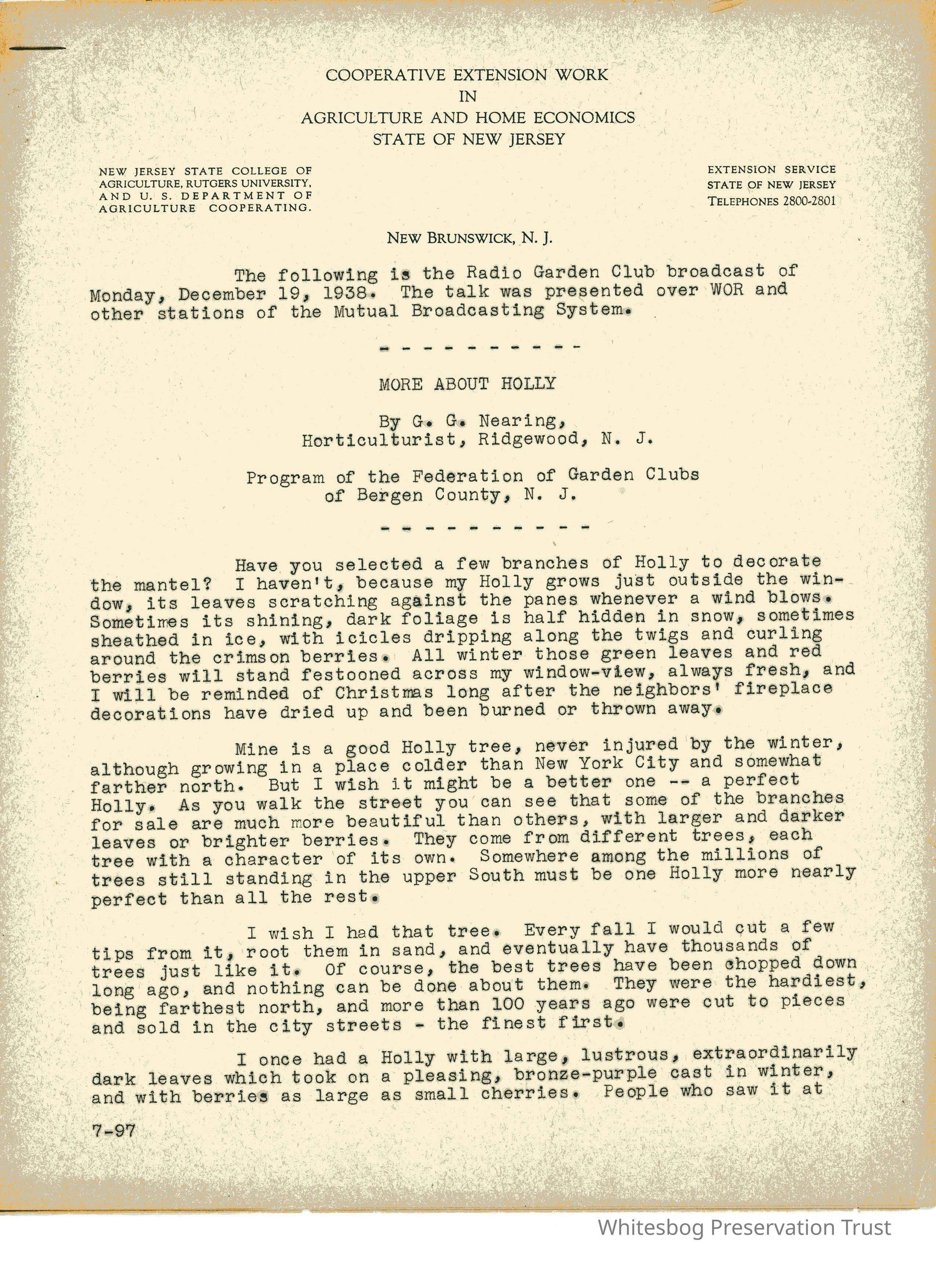 Talk given by G.G. Nearing, Horticulturist from Ridgewood, NJ, over WOR radio as a program of the Radio Garden Club.