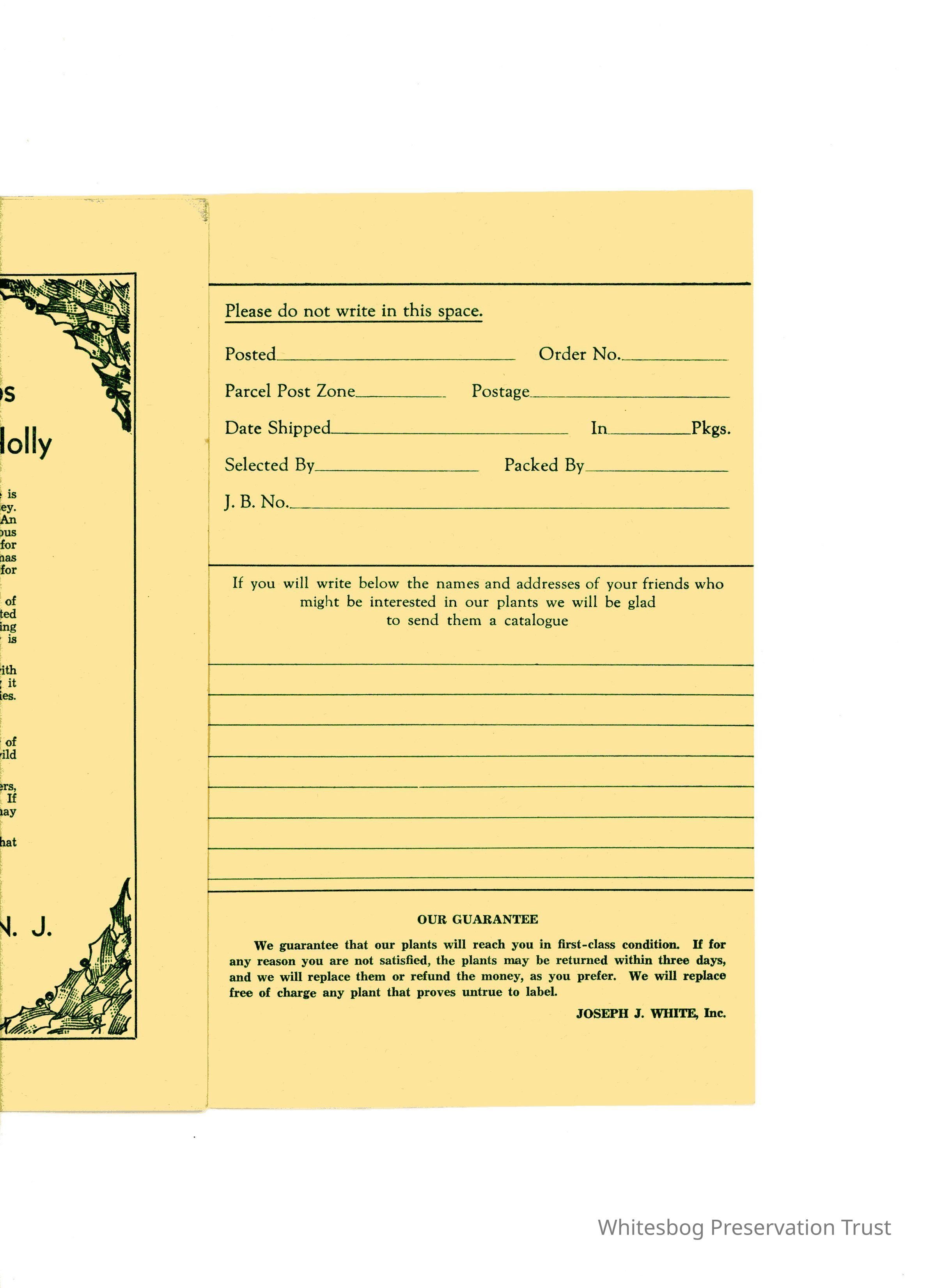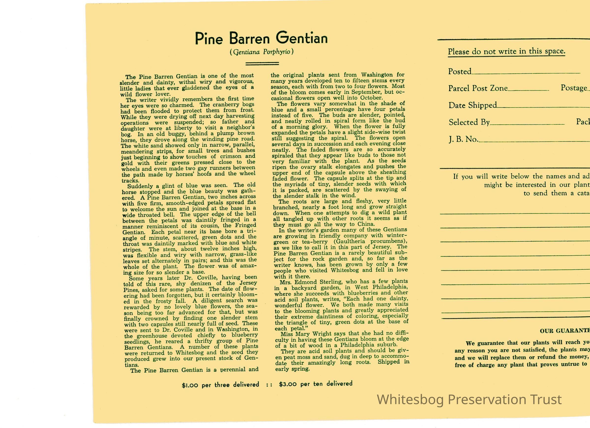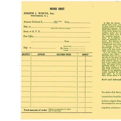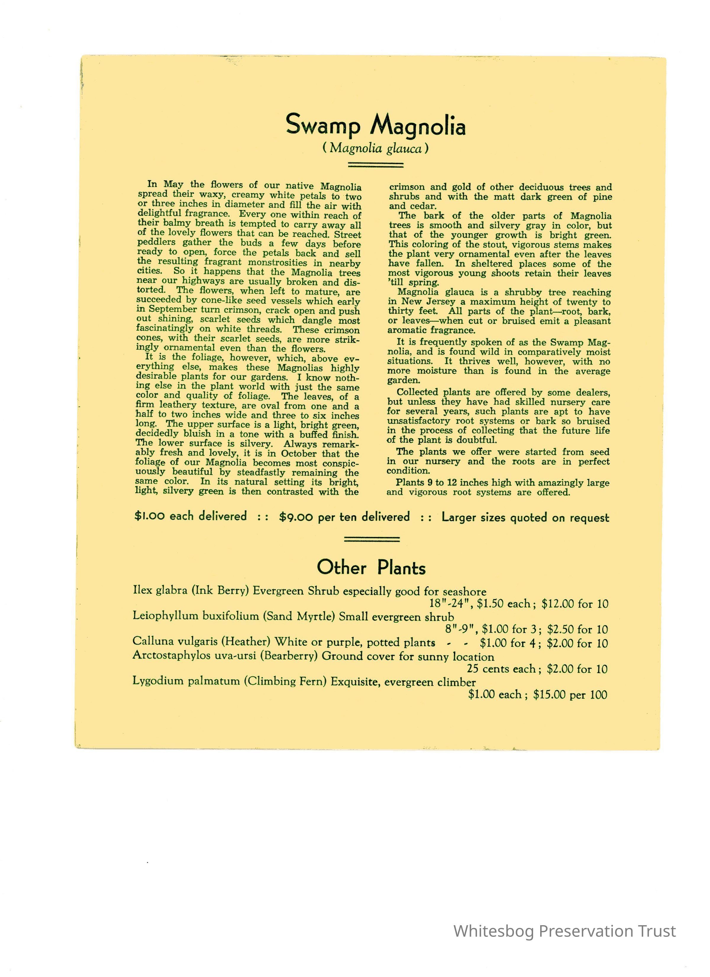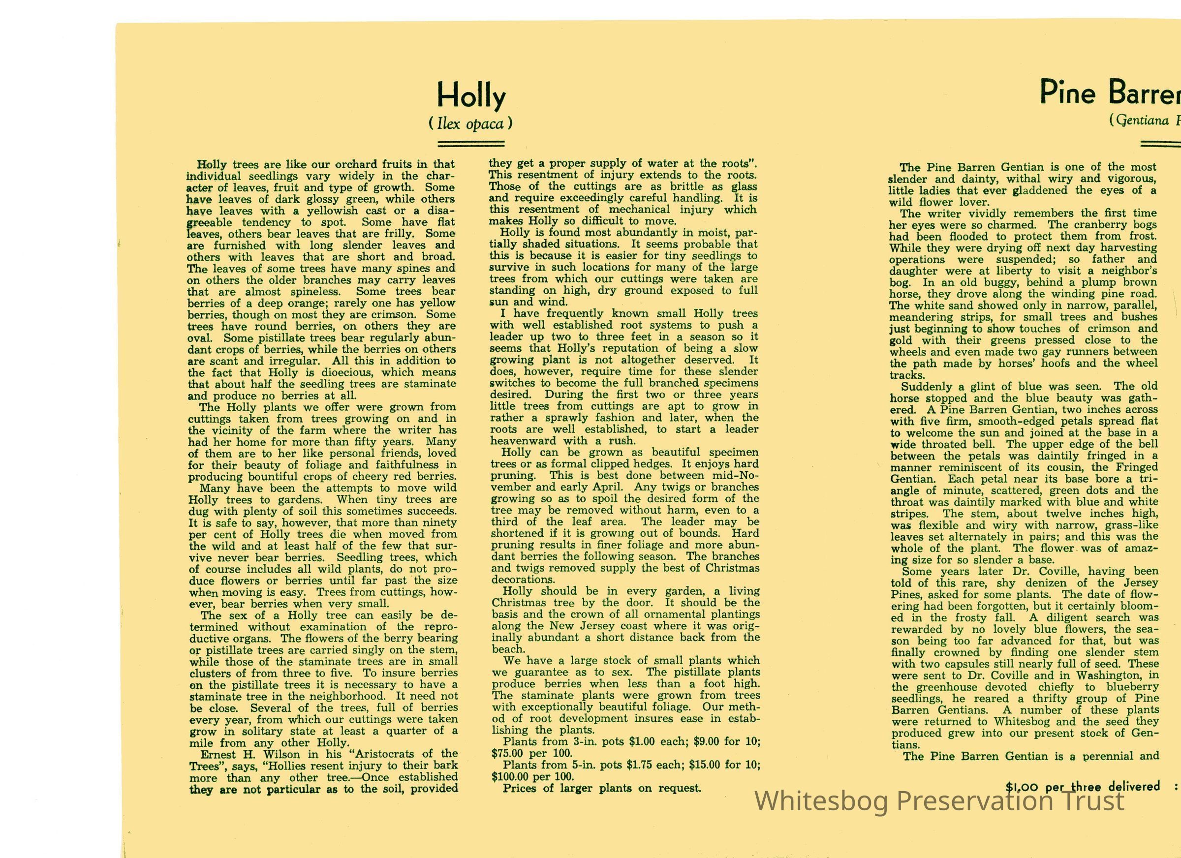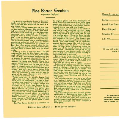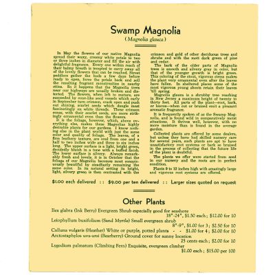 Again, no date. This brochure is different from other mail order lists in that it gives a detailed write-up on the plants for sale, mostly native Pine Barren plants. Prices/quantities are listed after write-up. Included are American Holly, Pine Barren Gentian, Swamp Magnolia. Listed unter "Other Plants" are Ink Berry, Sand Myrtle, Heather, Bearberry and Climbing Fern.