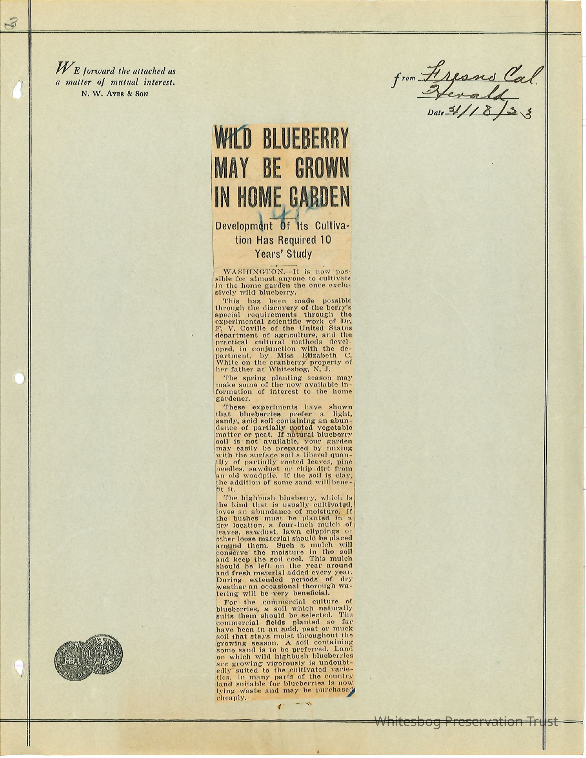 "Wild Blueberry May Be Grown in Home Garden" - Fresno, California Herald