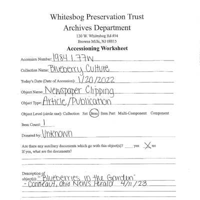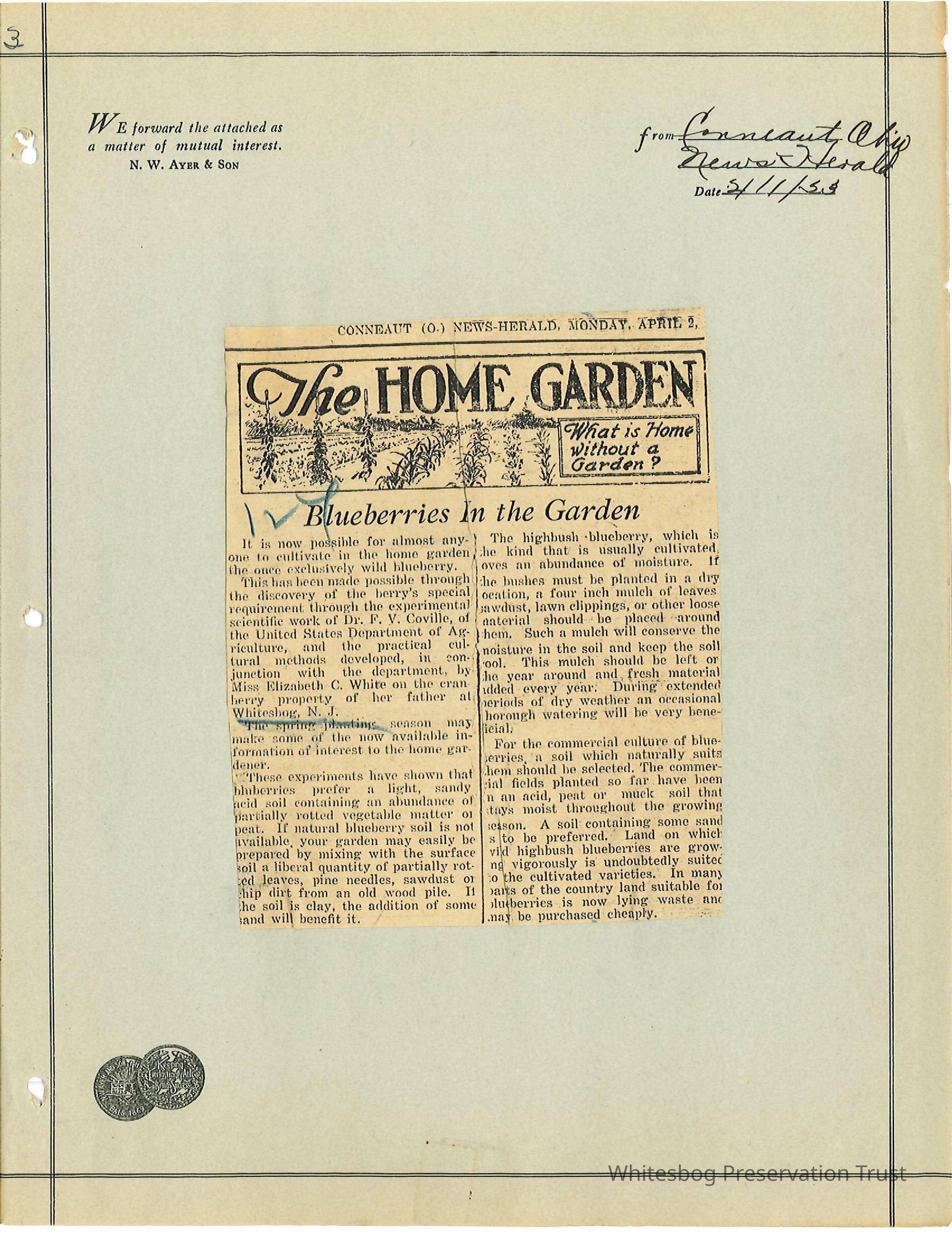 "Blueberries in the Garden" - Conneaut, Ohio News Herald 4/11/1923 Speaks of ECW and Coville's domestication of blueberry