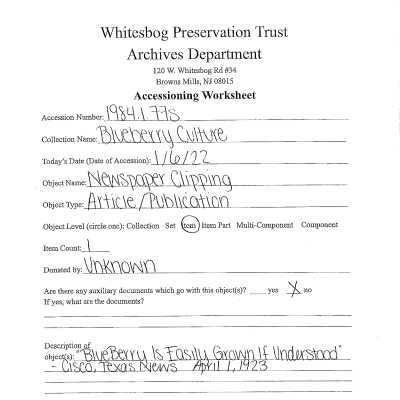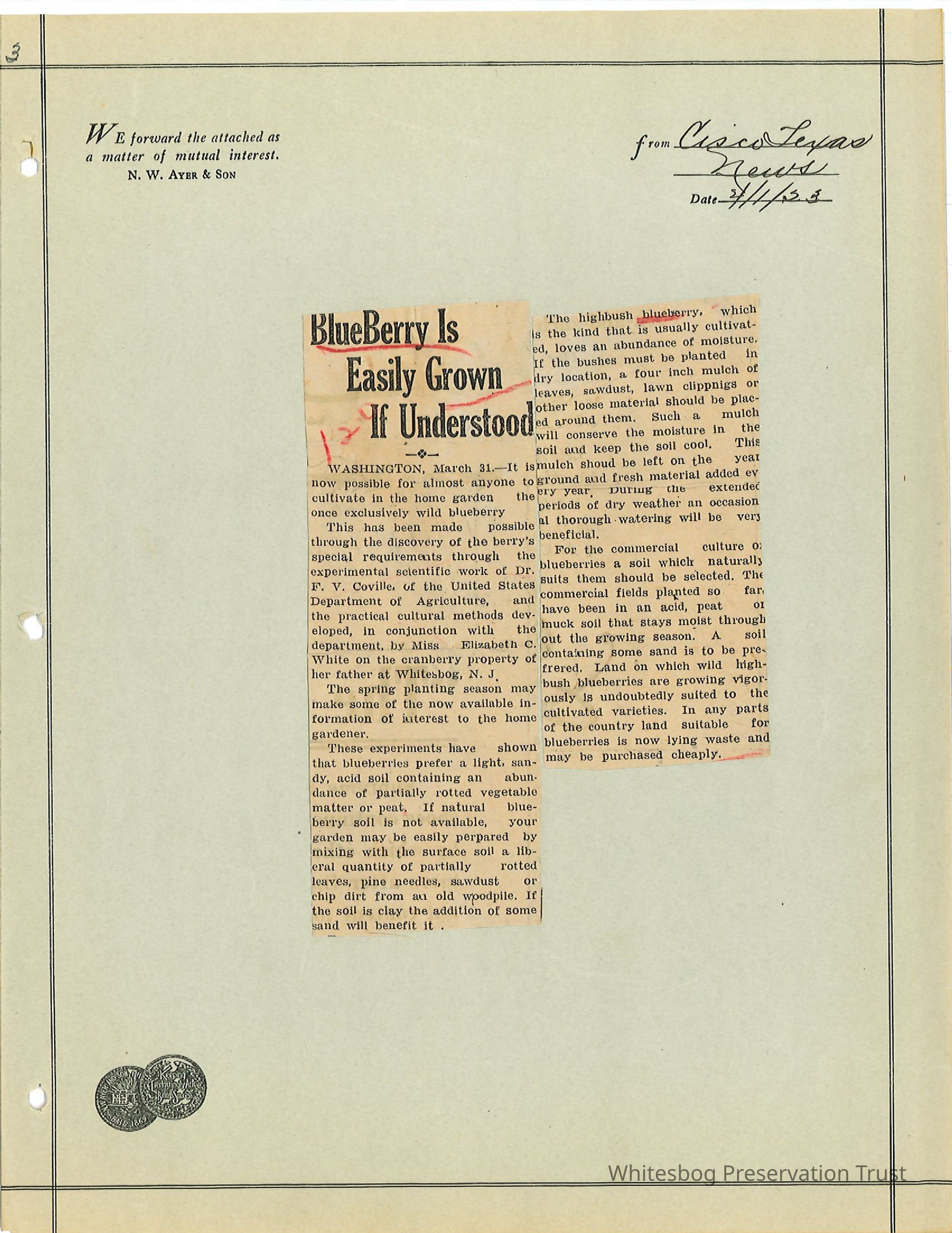 "BlueBerry is Easily Grown If Understood" - Cisco, Texas News April 1, 1923 Speaks of ECW and Coville's domestication of blueberry