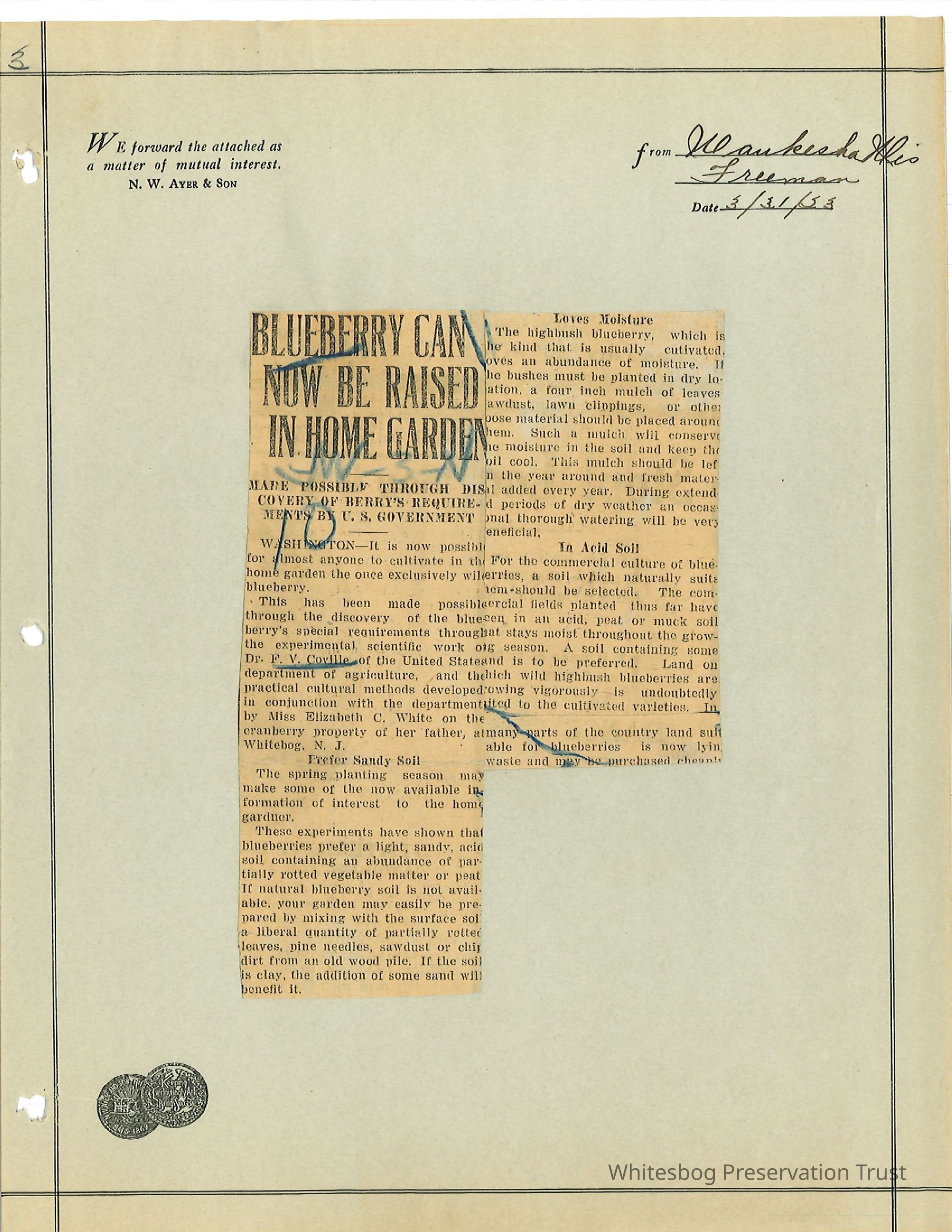 "Blueberries Can Now Be Raised in Home Garden" - Waukesha, Wis. Freeman