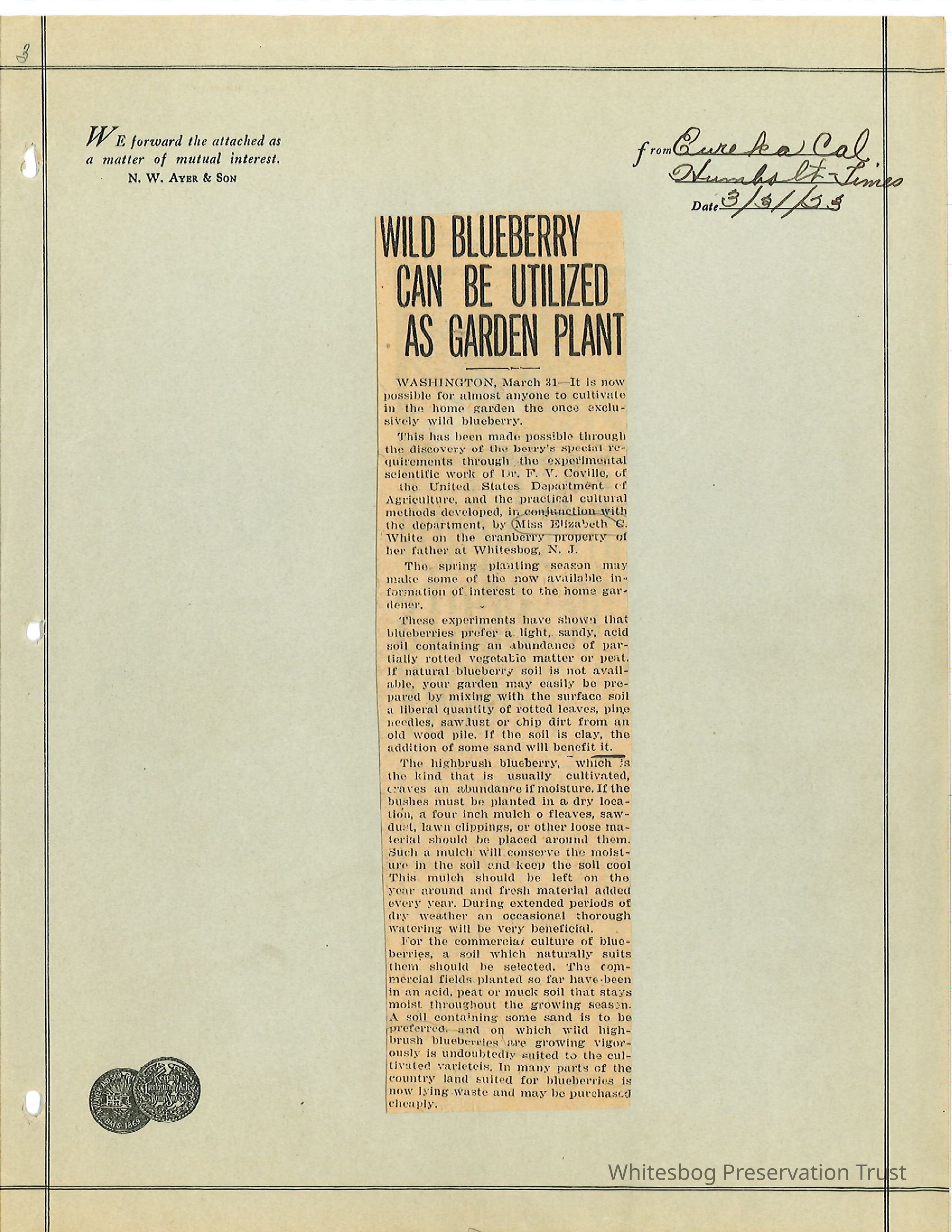 "Wild Blueberry Can Be Utilized As Garden Plant" - Eureka, California Humbsolt Times