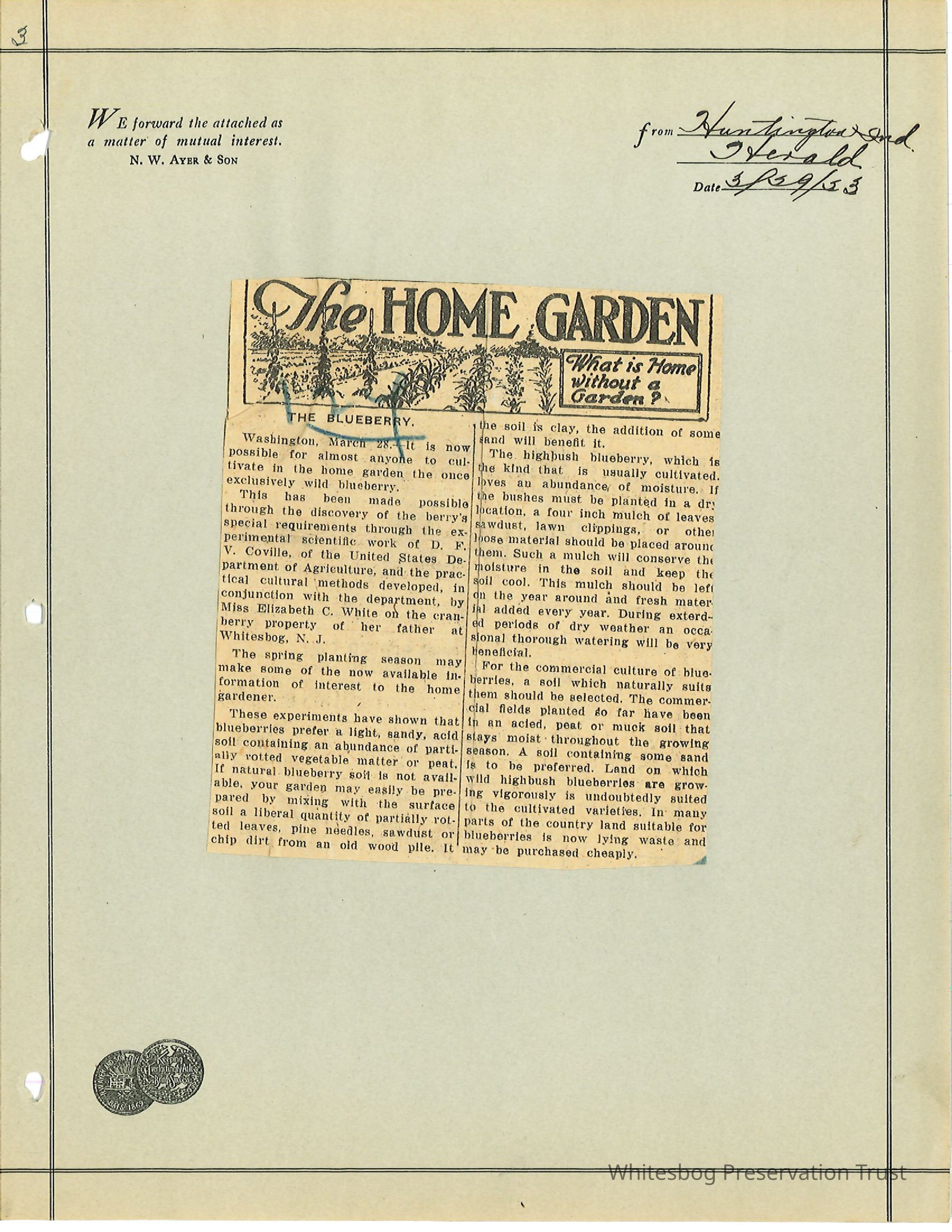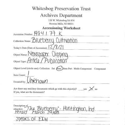 "The Blueberry" -Huntington, Ind. Herald March 29, 1923 Speaks of ECW and Coville's work domesticating the blueberry