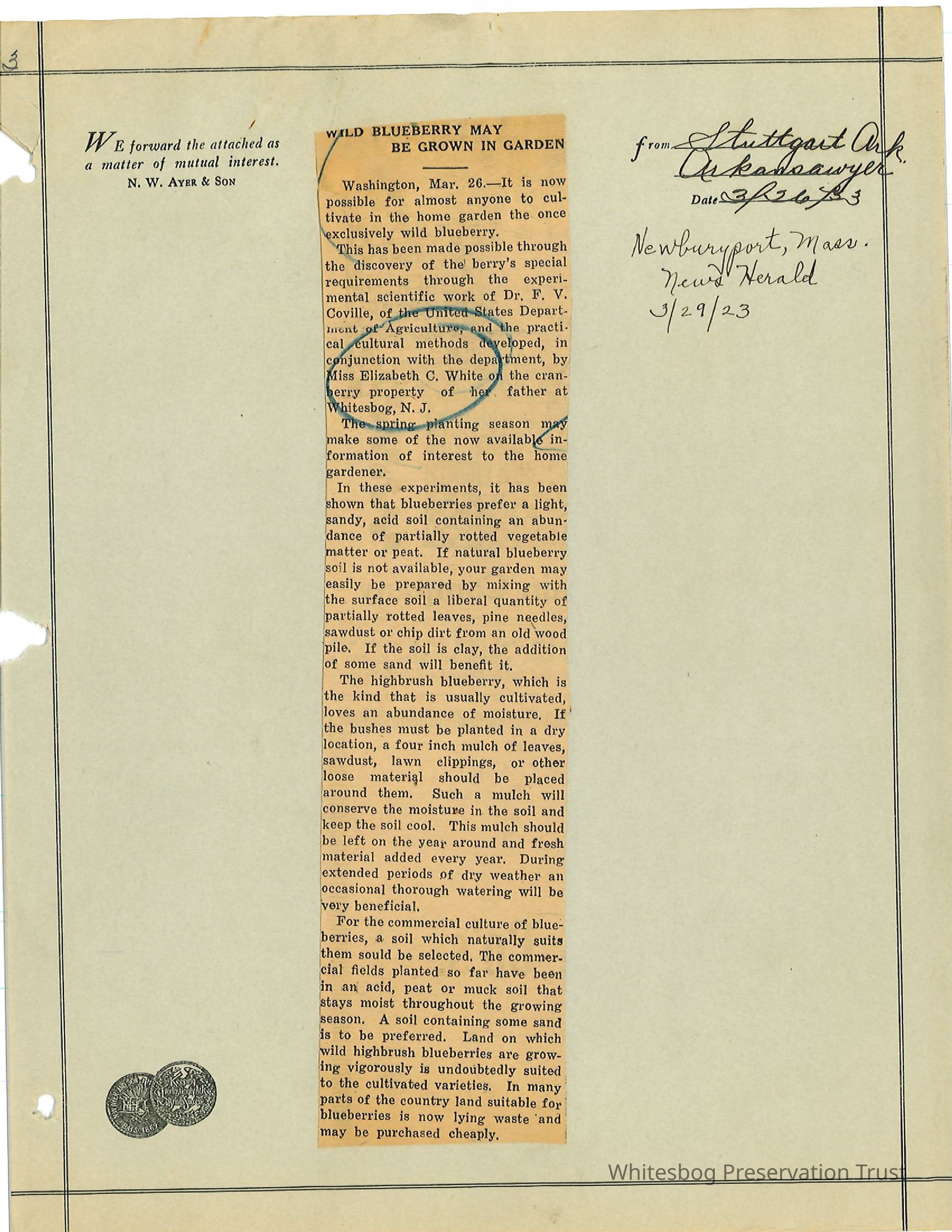 "Wild Blueberry May Be Grown in Garden" -Stuttgart, Ark. Arkansawyer