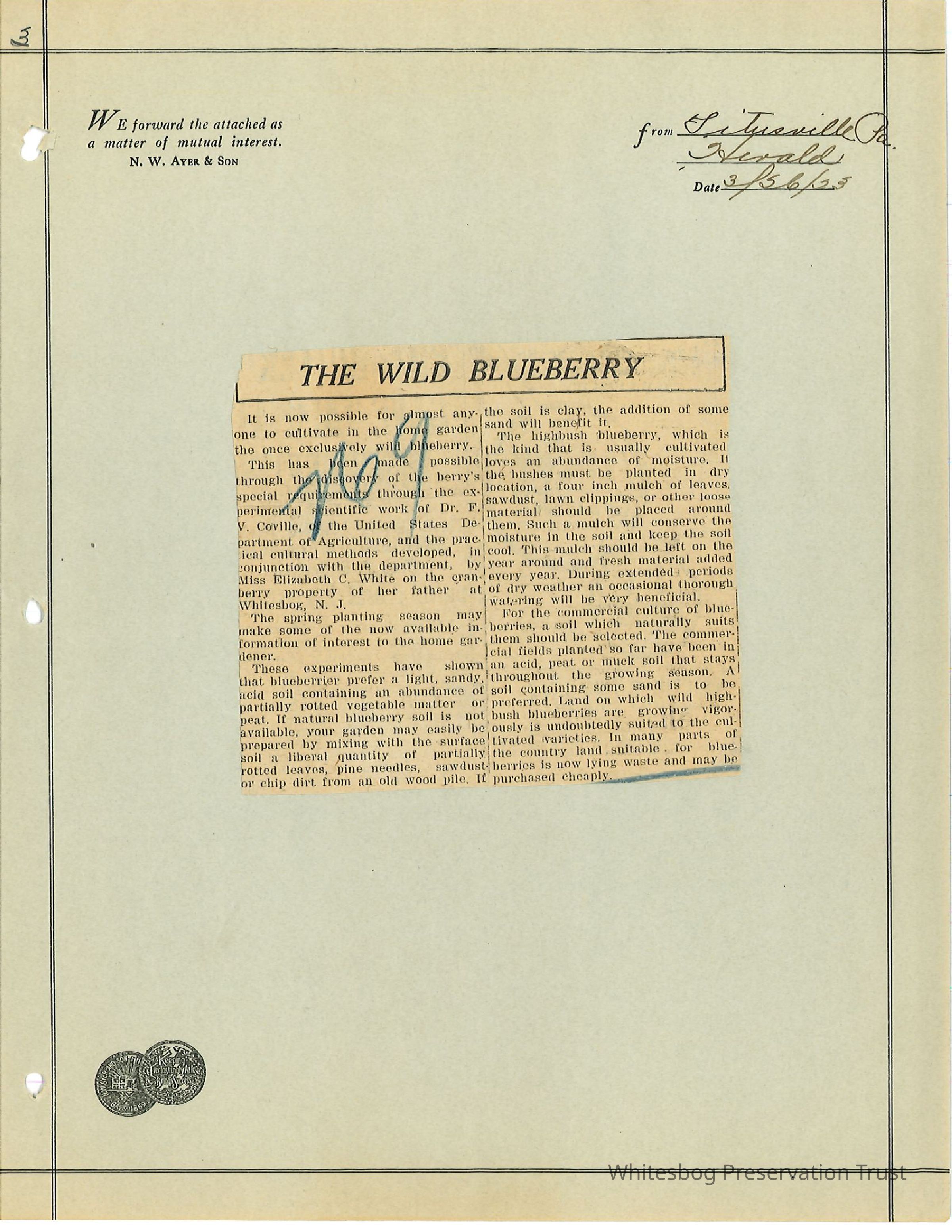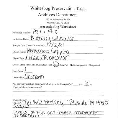 "The Wild Blueberry" - Titusville, PA Herald March 26, 1923 Speaks of ECW and Coville's domestication of blueberry