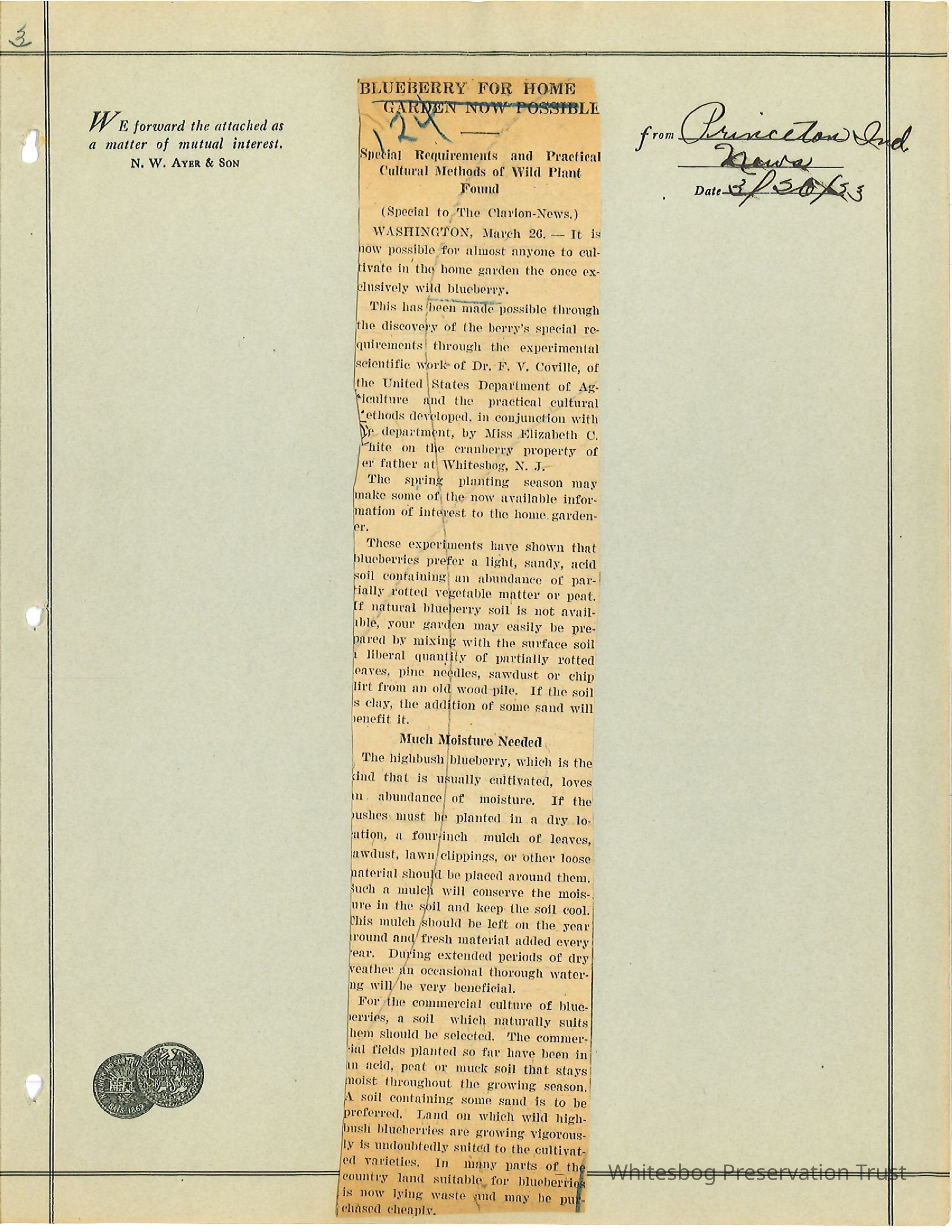 "Blueberry For Home Garden Now Possible" - Princeton, Ind. News