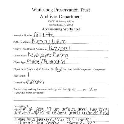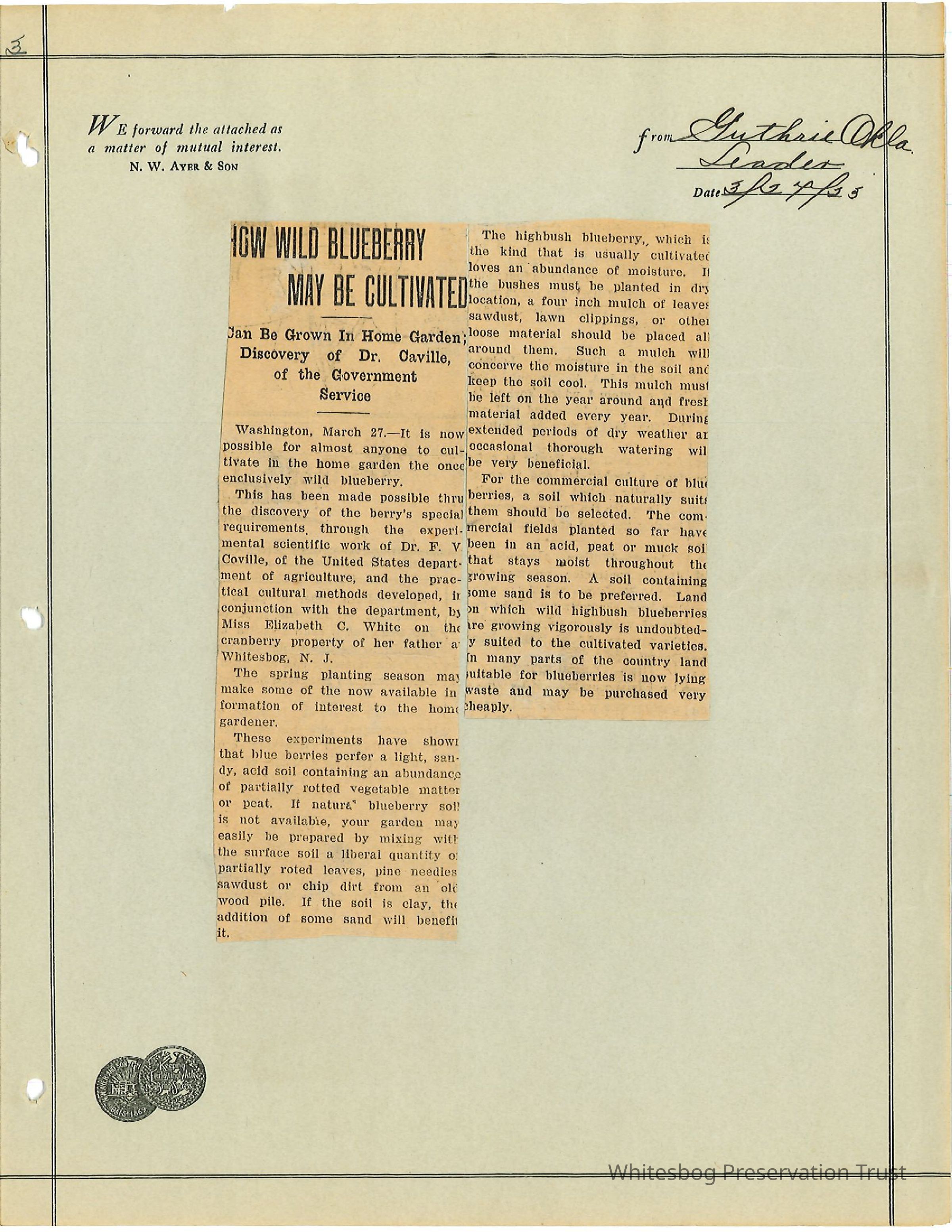 An article highlighting the work being done by Elizabeth White and Dr. Coville at Whitesbog, NJ. Highlights the importance of the acidic soil.Collection