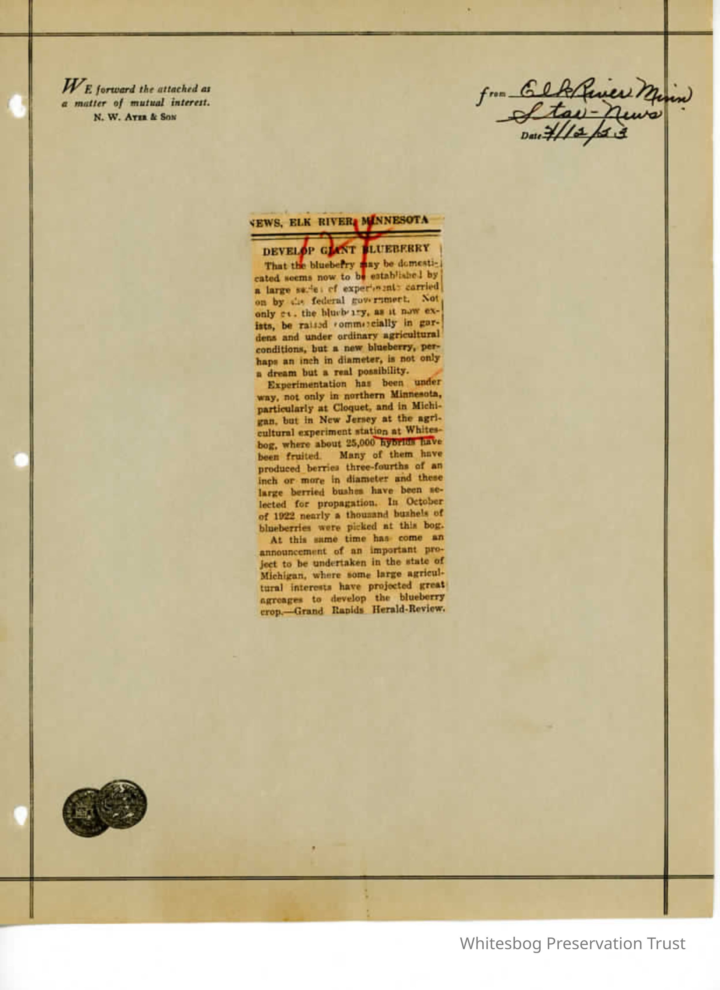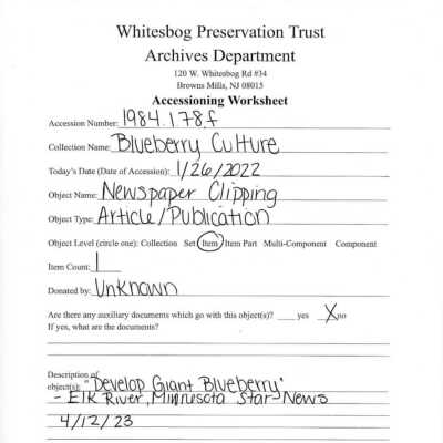 Speaks of the experimentation and work done at Whitesbog by the USDA. No mention of ECW or Coville. Notes at the end information comes from Grand Rapids Review newspaper, 1984.1.78.dCollection