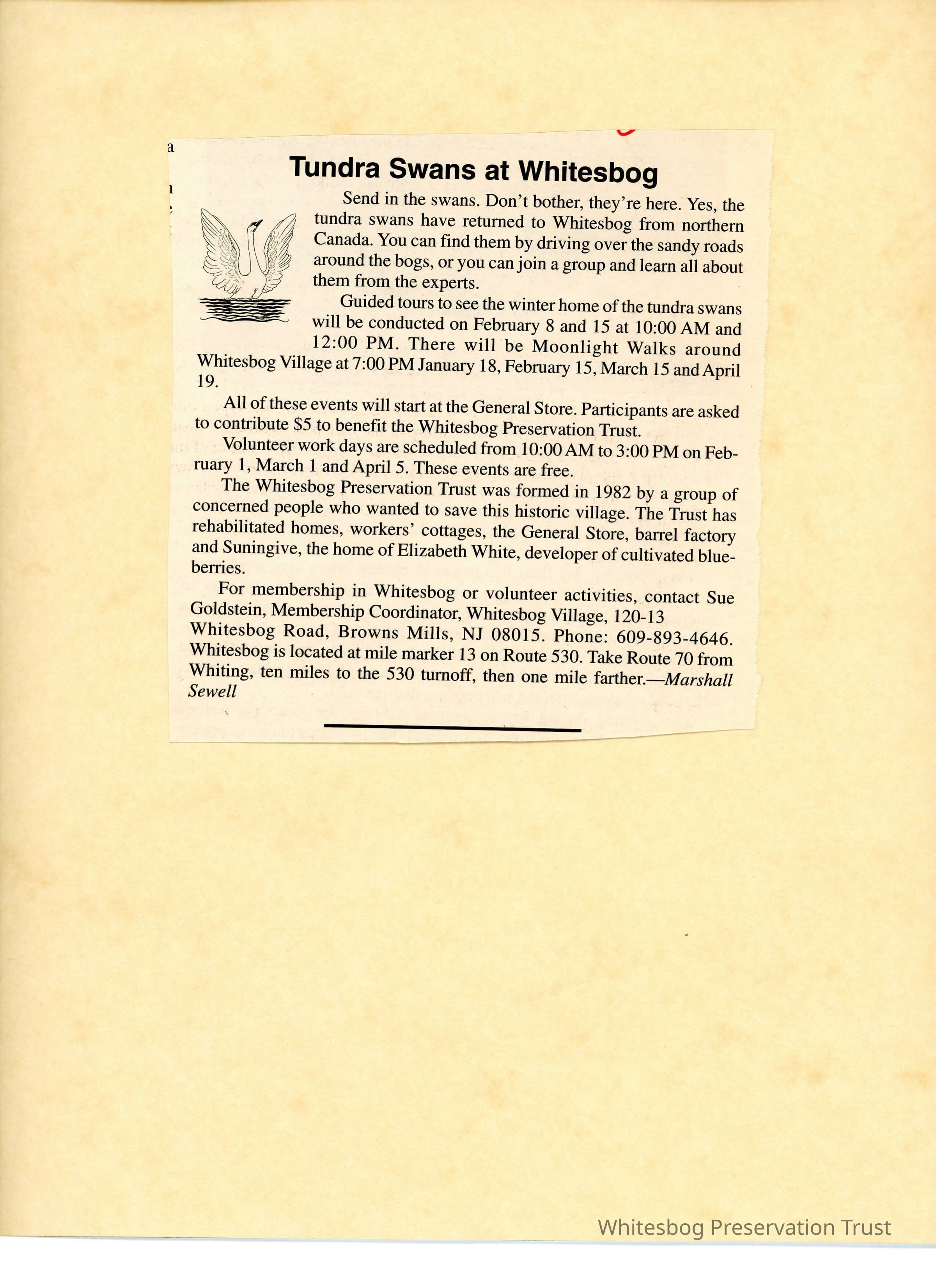 Advertisement about tours given at Whitesbog that focus on the tundra swans. Includes dates for tours throughout the Spring and the quote "send in the swans. Don't bother, they're here."