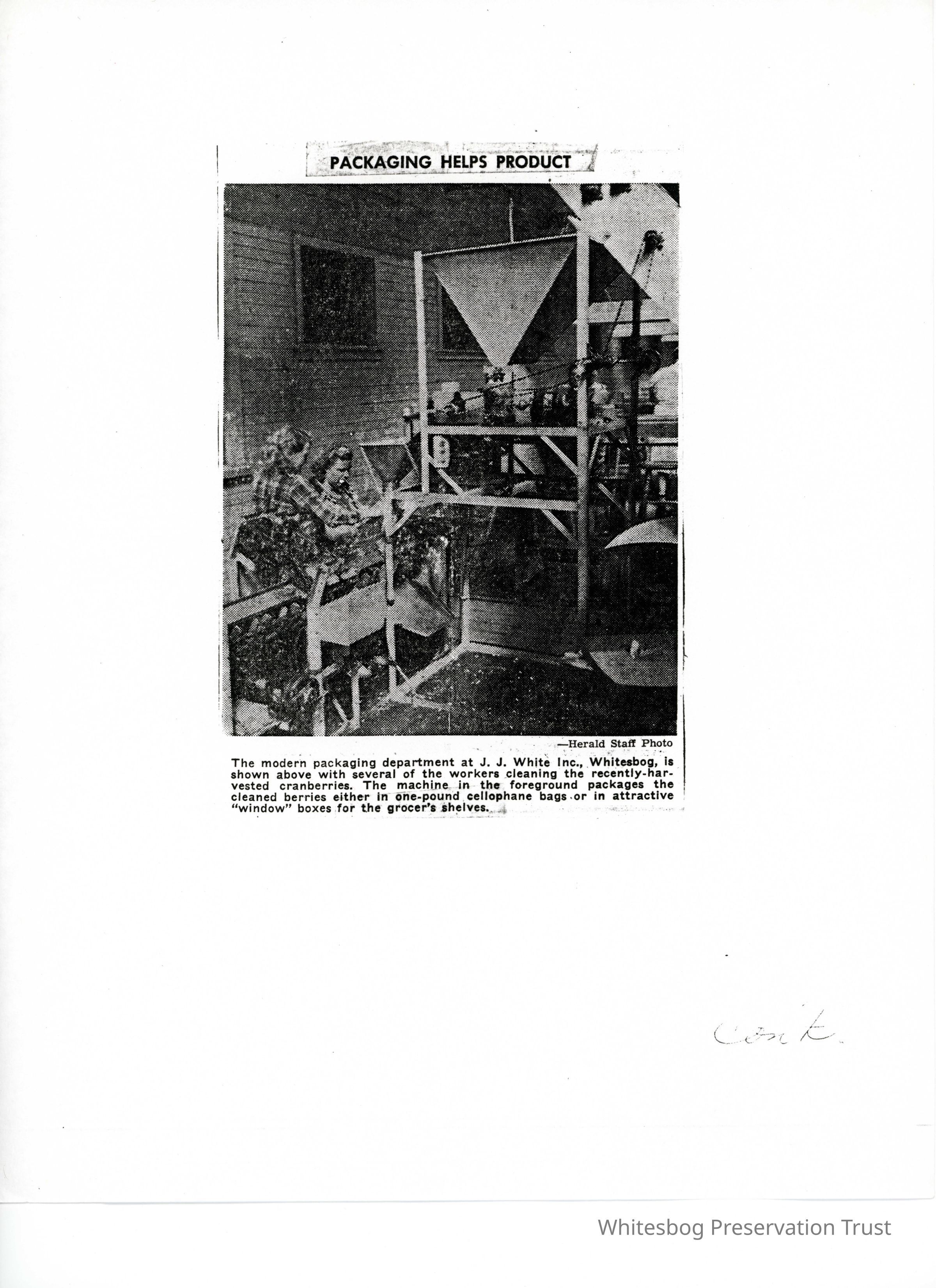 A picture taken in the 1940s of blueberry packaging equipment. The caption reads, "The modern packaging department at J.J. White Inc., Whitesbog, is shown above with several of the workers cleaning the recently harvested cranberries. The machine in the foreground packages the cleaned berries either in one pound cellophane bags or in attractive 'window' boxes for the grocer's shelves."