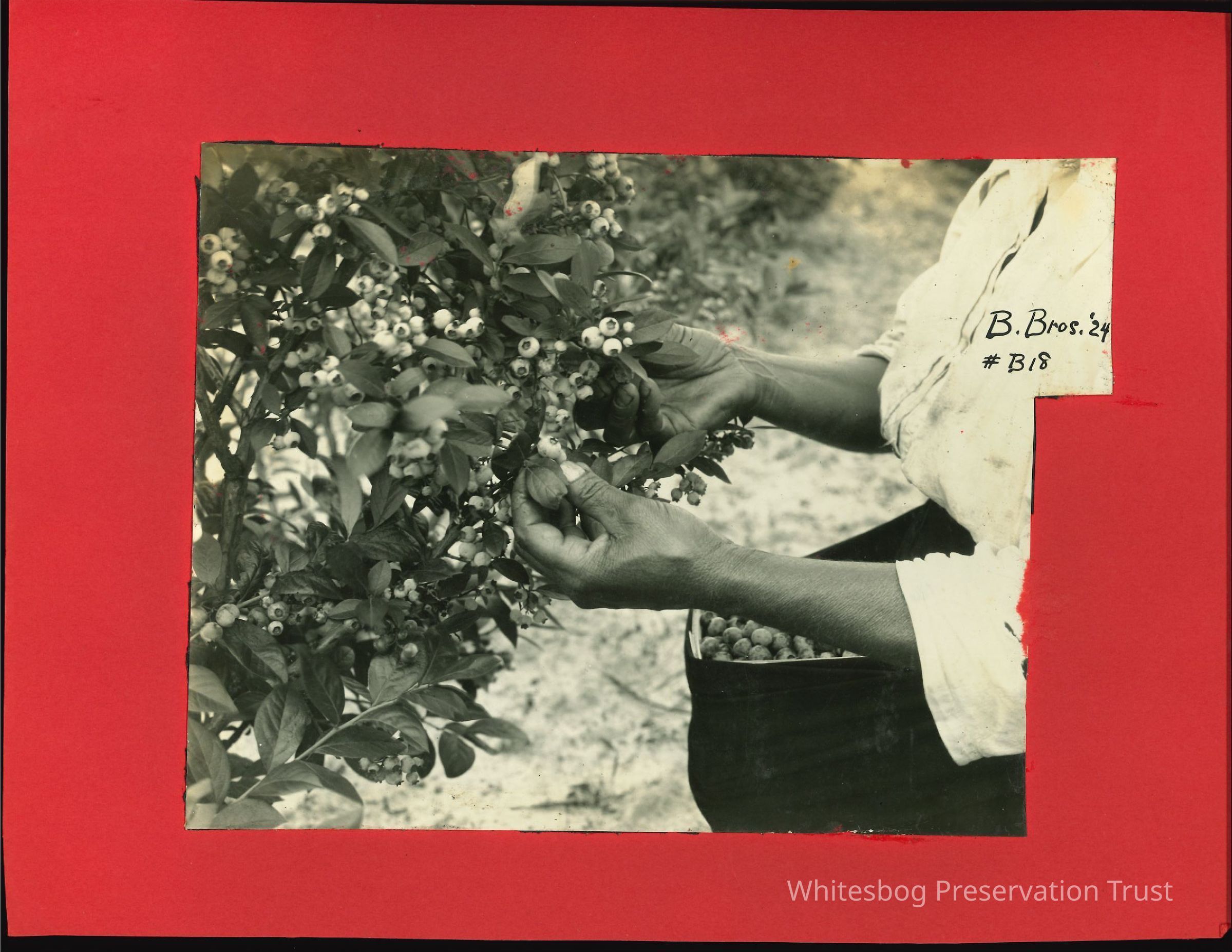 Dark-skinned women picking blueberries. Note: Blueberry container held in apron so both hands are free to pick berries. A good picker could bring in 200 quarts/day; some plants will produce 32 quarts/season.