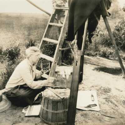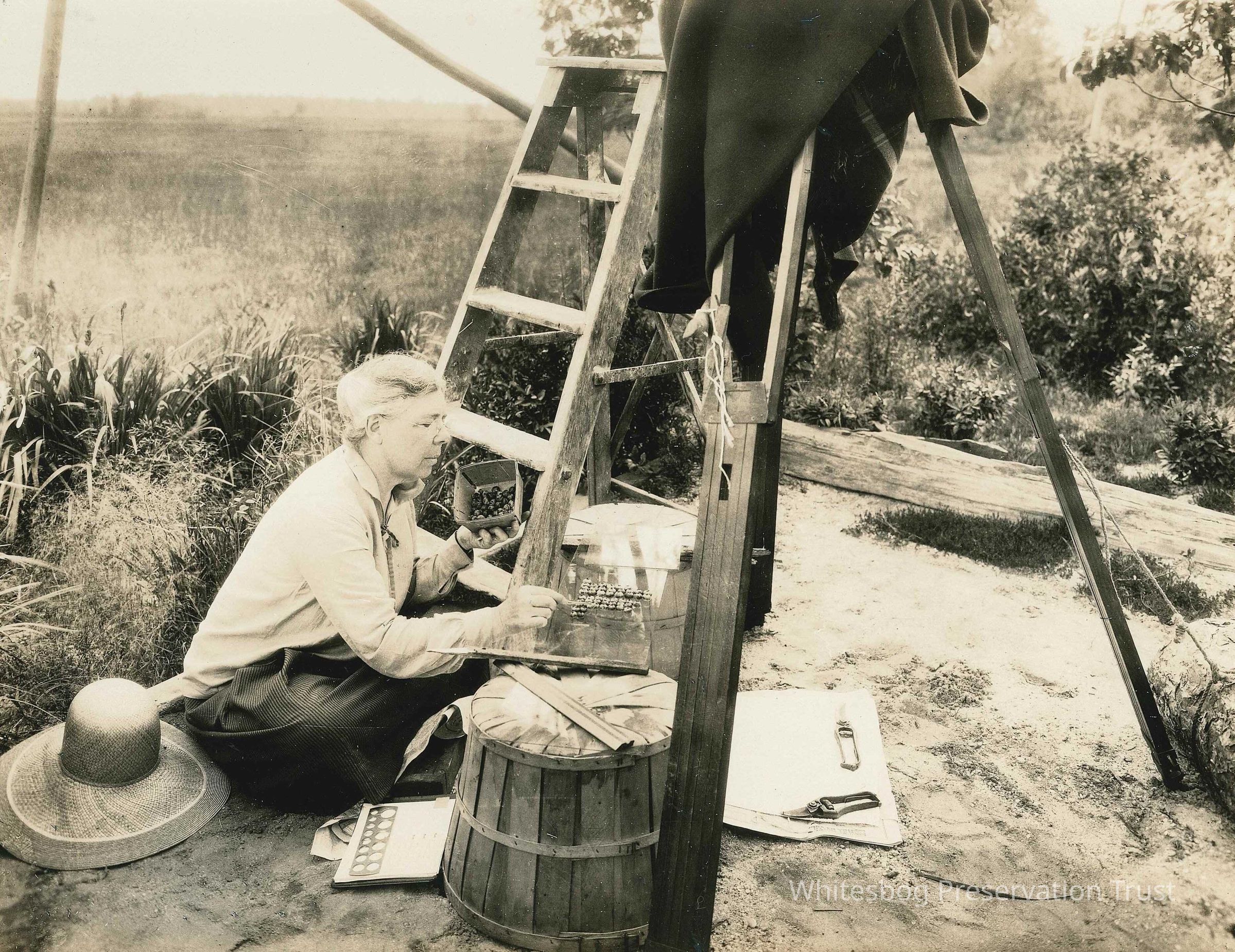 Elizabeth White arranging blueberries to highlight size. Camera is on a tripod to the right. Photograph will be used for commercial advertising. Two original photographs.Collection