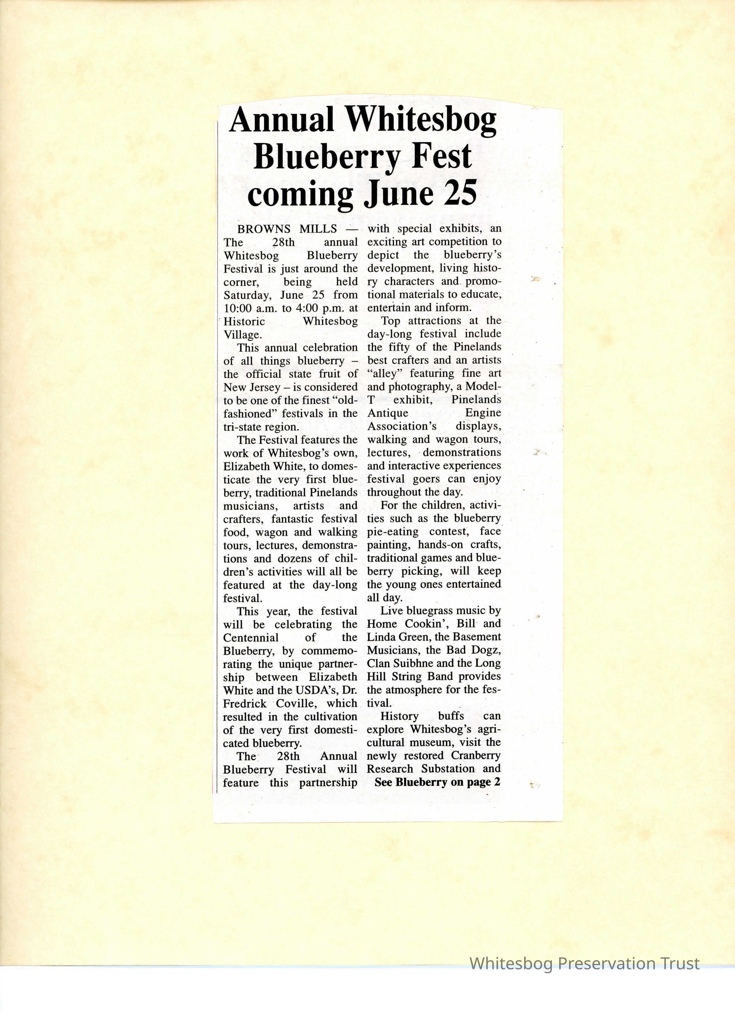 An article about the 2011 blueberry festival, including expected activities and the quote, "This annual celebration of all things blueberry - the official state fruit of New Jersey - is considered to the one of the finest 'old fashioned' festivals in the tri-state region."
