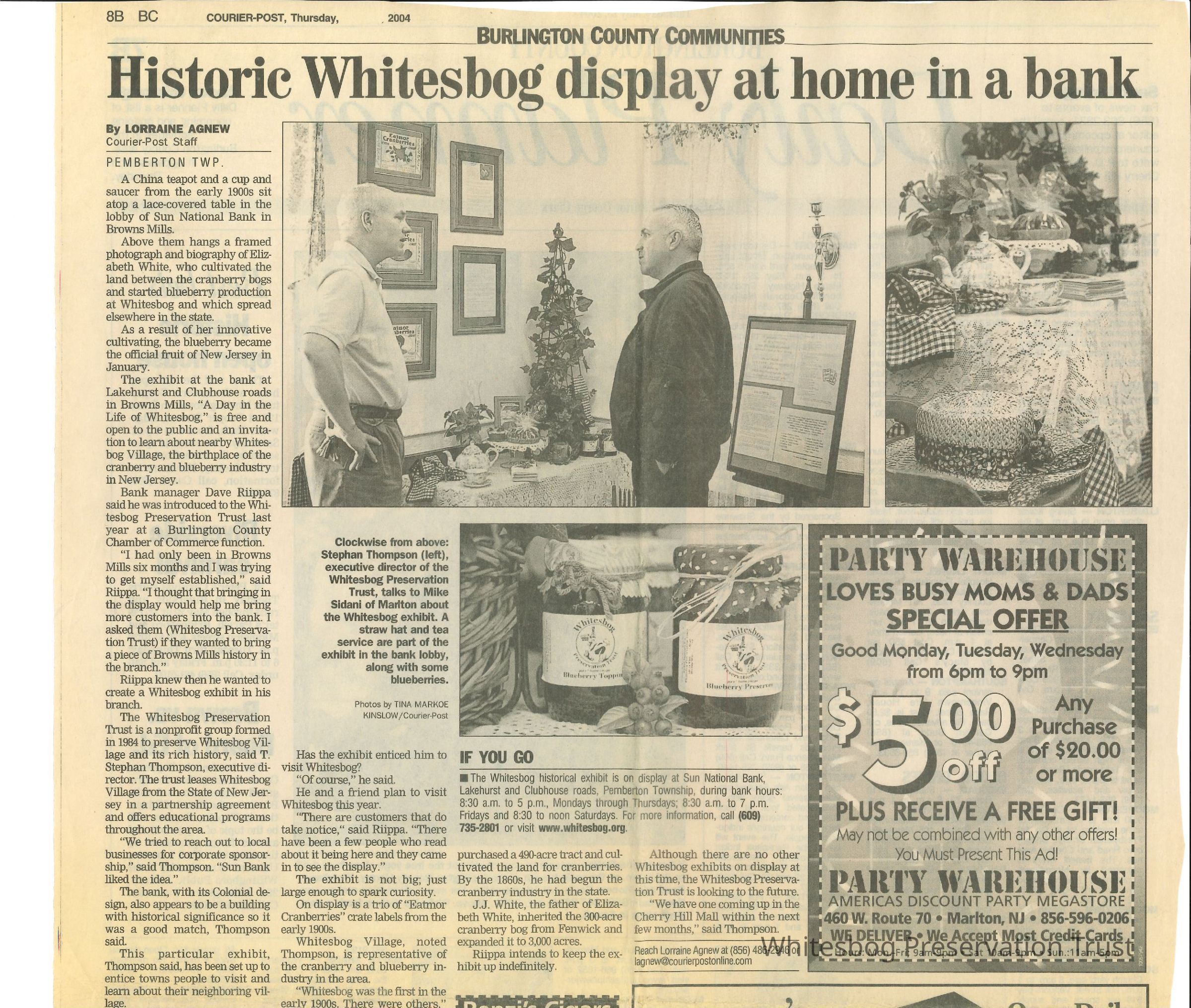 An article about a display at the Sun National Bank in Browns Mills featuring information and pictures from Whitesbog. Includes the quote, "This particular exhibit, Thompson said, has been set up to entice towns people to visit and learn about their neighboring village."
