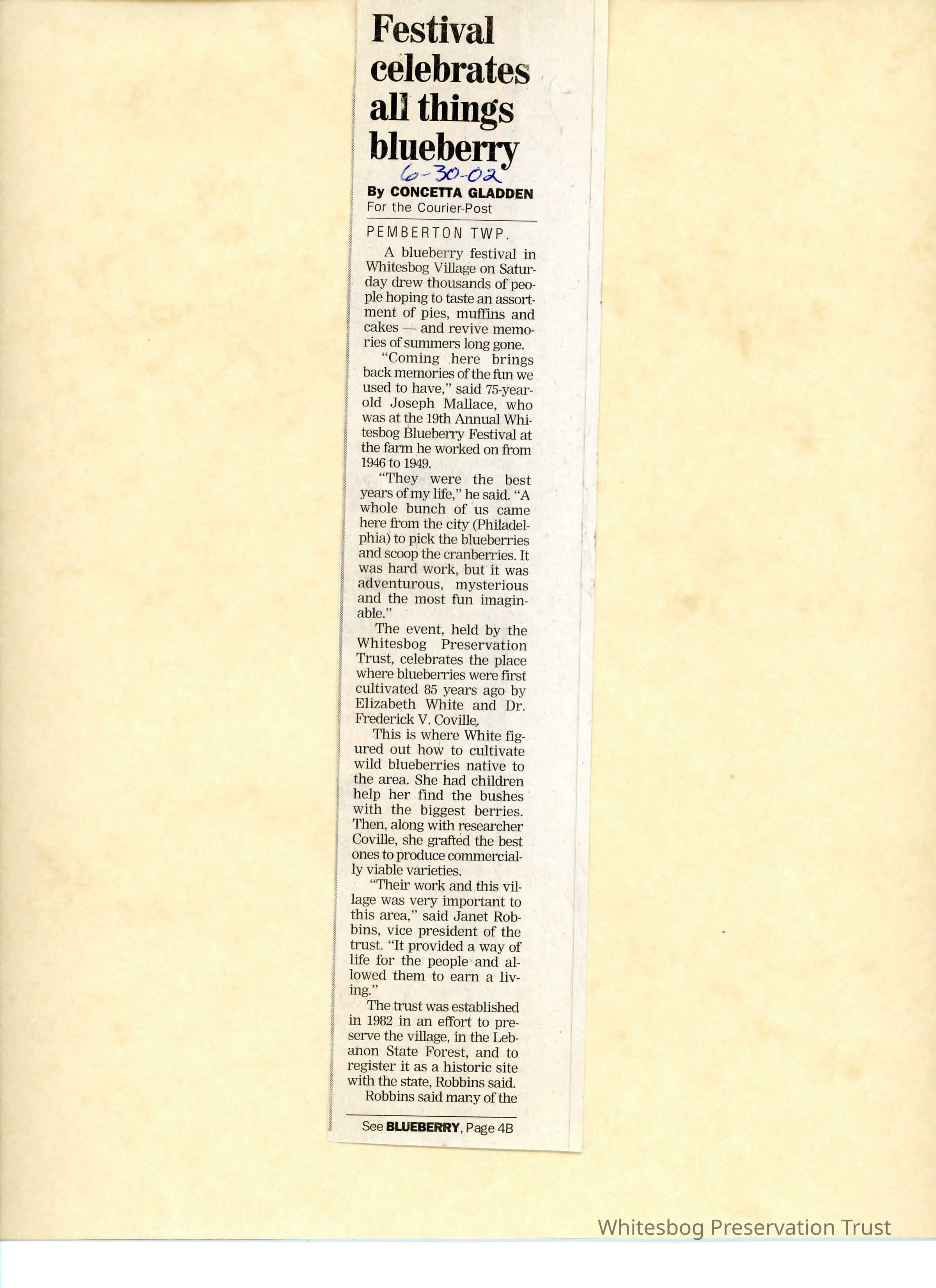 This is an article about the success of the 2002 blueberry festival despite losing the blueberry crop that year. It makes note that buildings of Whitesbog had been vandalized before the Whitesbog Preservation Trust became involved, but now are being restored, and protected, thanks to the Trust.