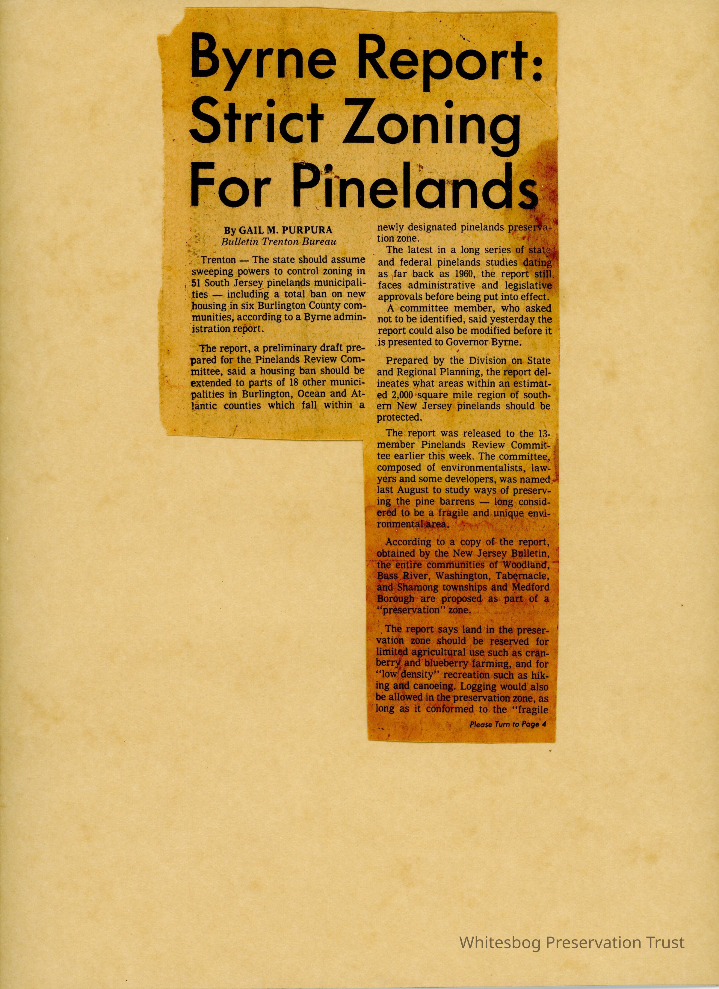 An article about banning any future, major development in the Pine Barrens area in an effort to preserve the region.