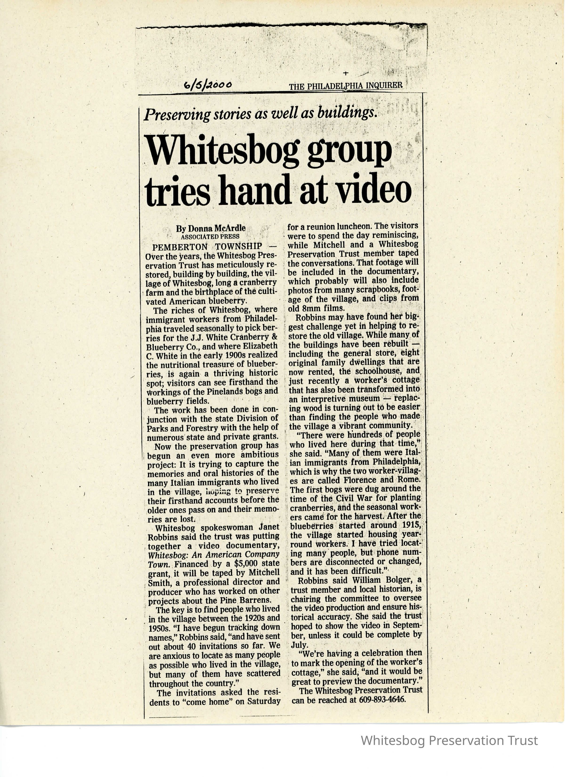 A copy of a newspaper article about the making of the documentary "Whitesbog: An American Company Town". The film was financed by a $5,000 grant from the state. The article outlines the difficulties in finding people to interview, and things that will be included , like old pictures and 8mm footage.