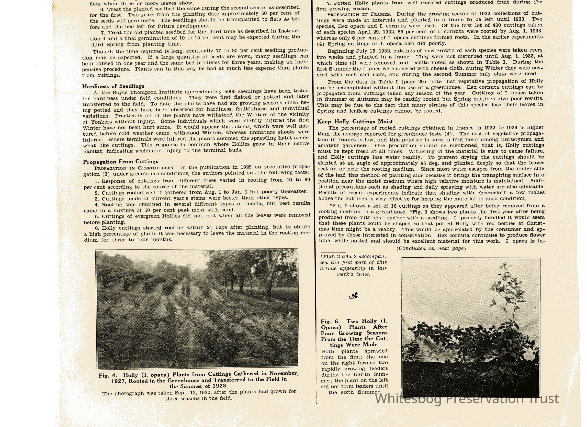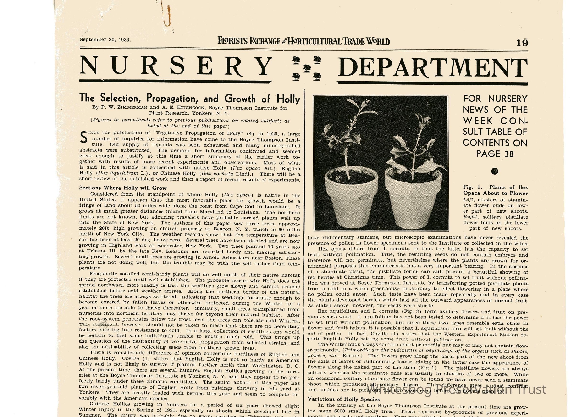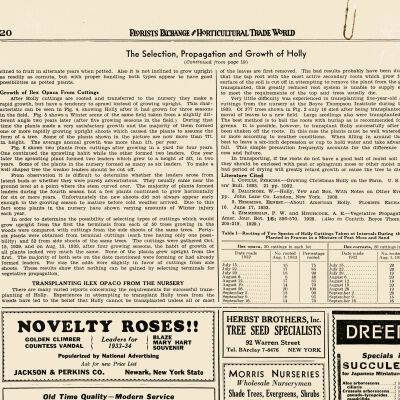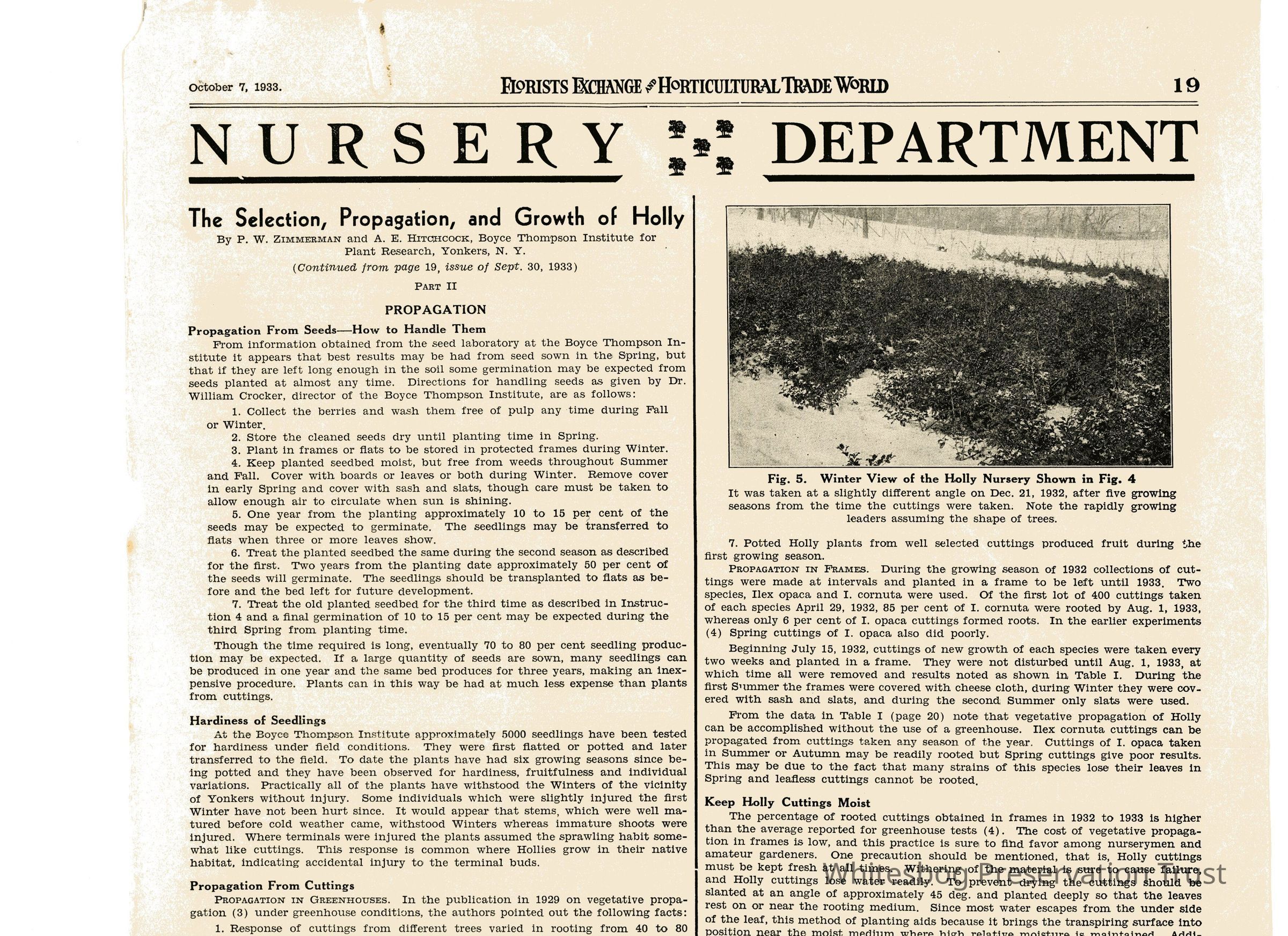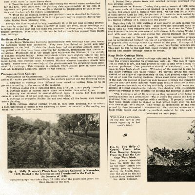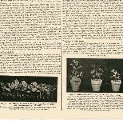 The article addresses locales where holly will grow, fruiting characteristics and variations in holly species. A lengthy portion is devoted to propagation by seeding and propagation from cuttings.