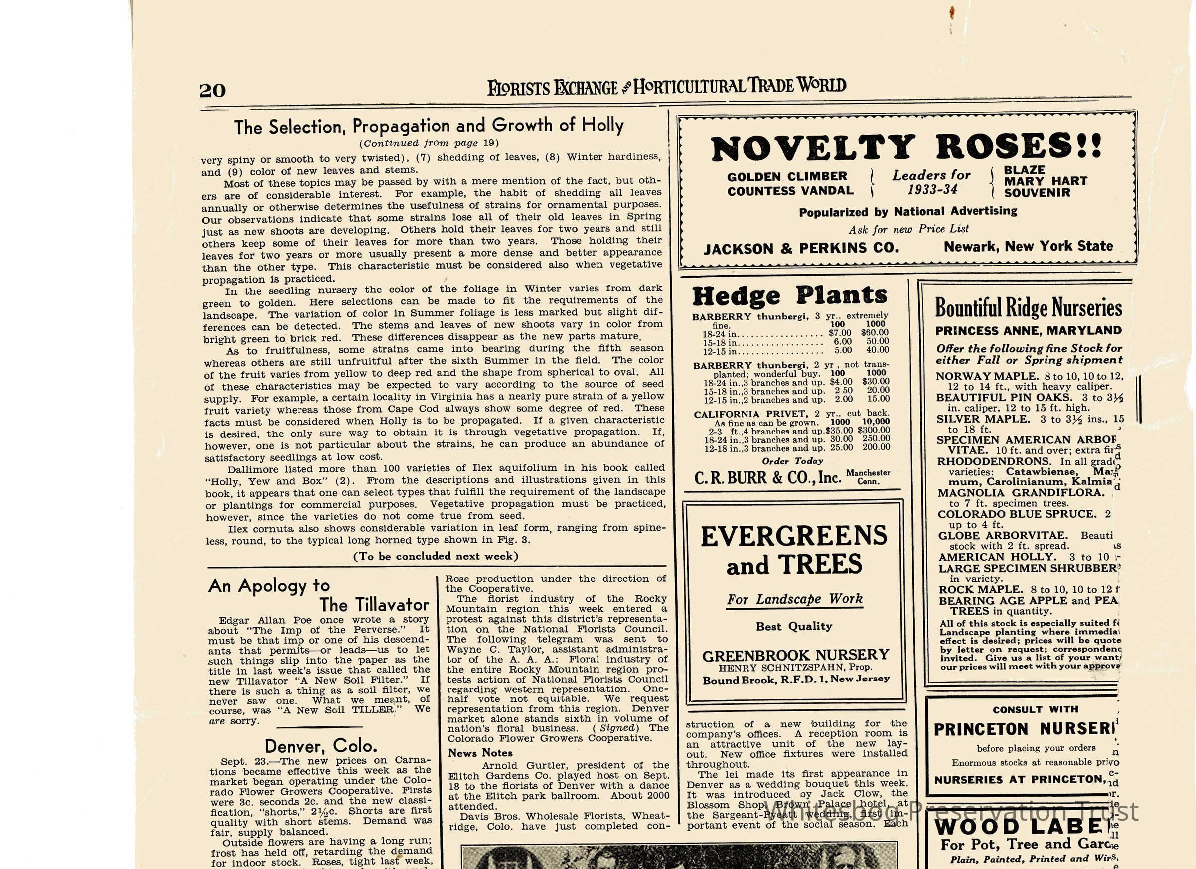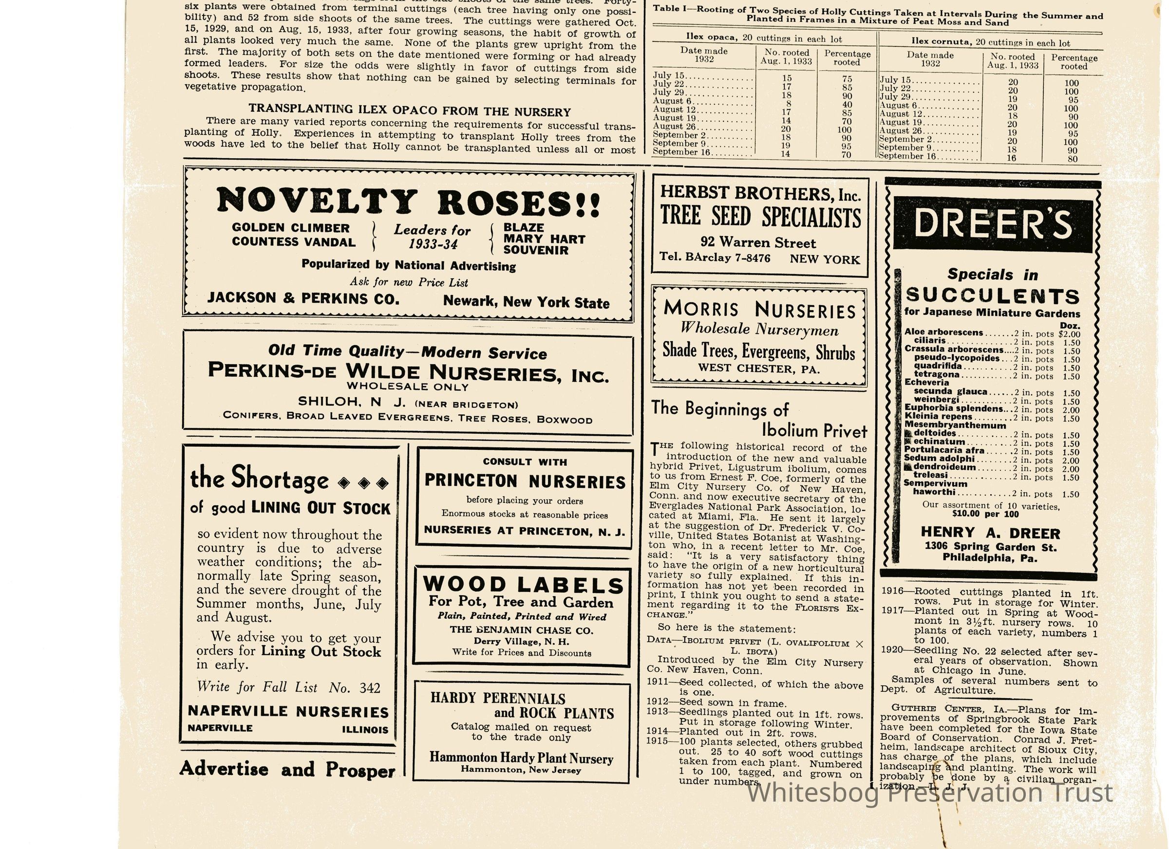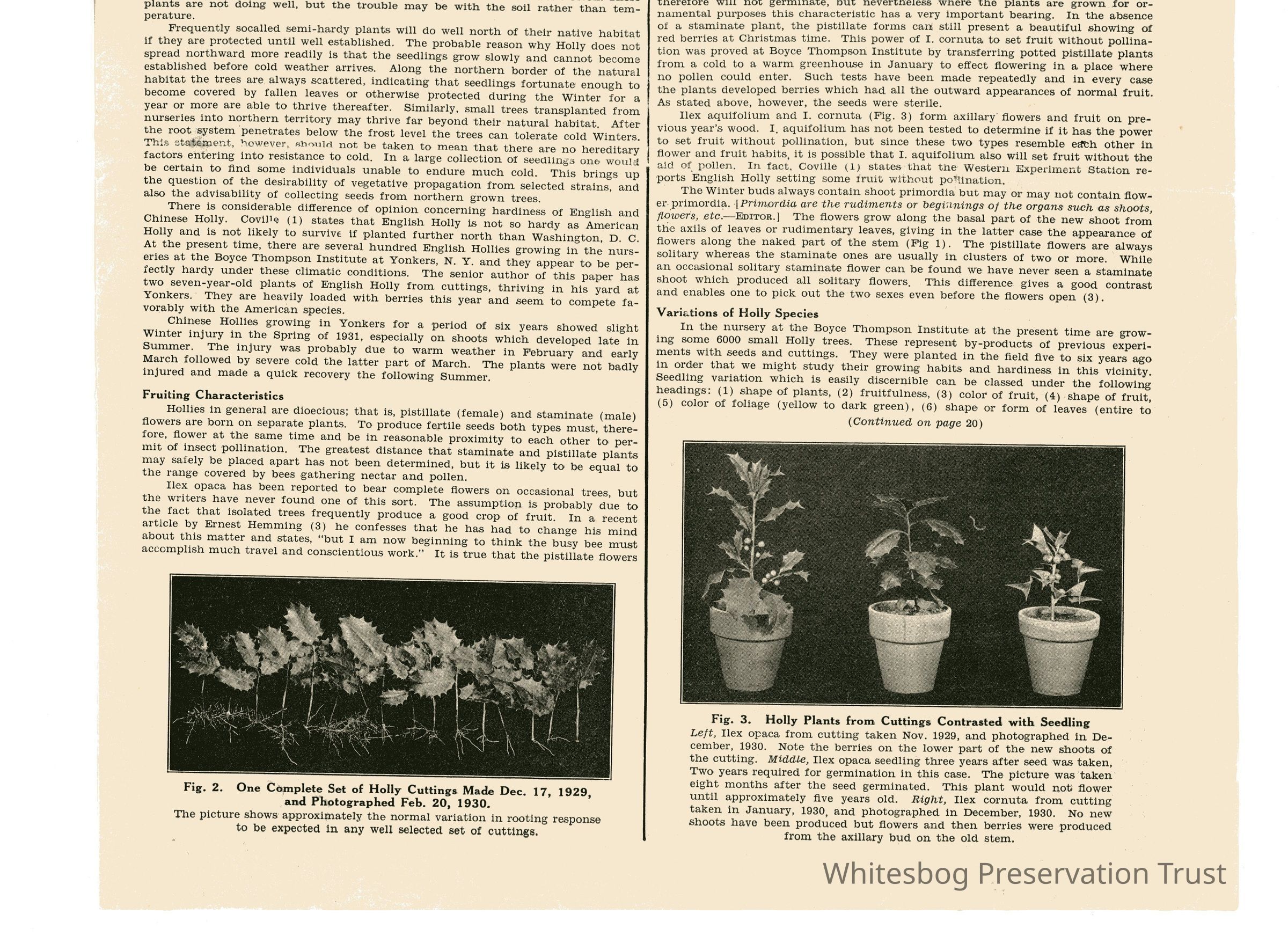 The article addresses locales where holly will grow, fruiting characteristics and variations in holly species. A lengthy portion is devoted to propagation by seeding and propagation from cuttings.