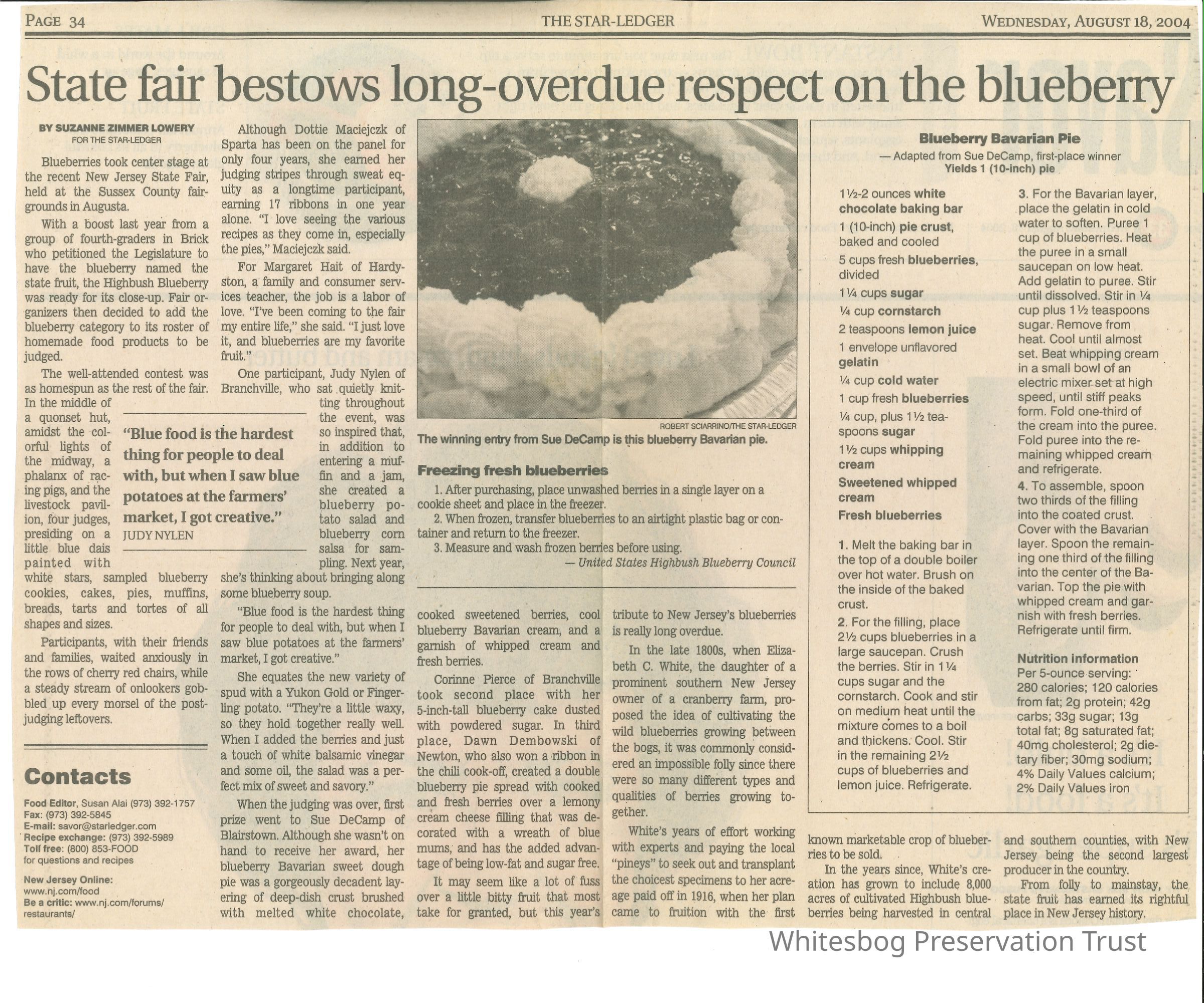 An article about how the blueberry was featured at the 2004 New Jersey State Fair held at the Sussex County Fair Grounds in Augusta. It mentions Elizabeth White, and includes one recipe and tips on how to freeze blueberries.