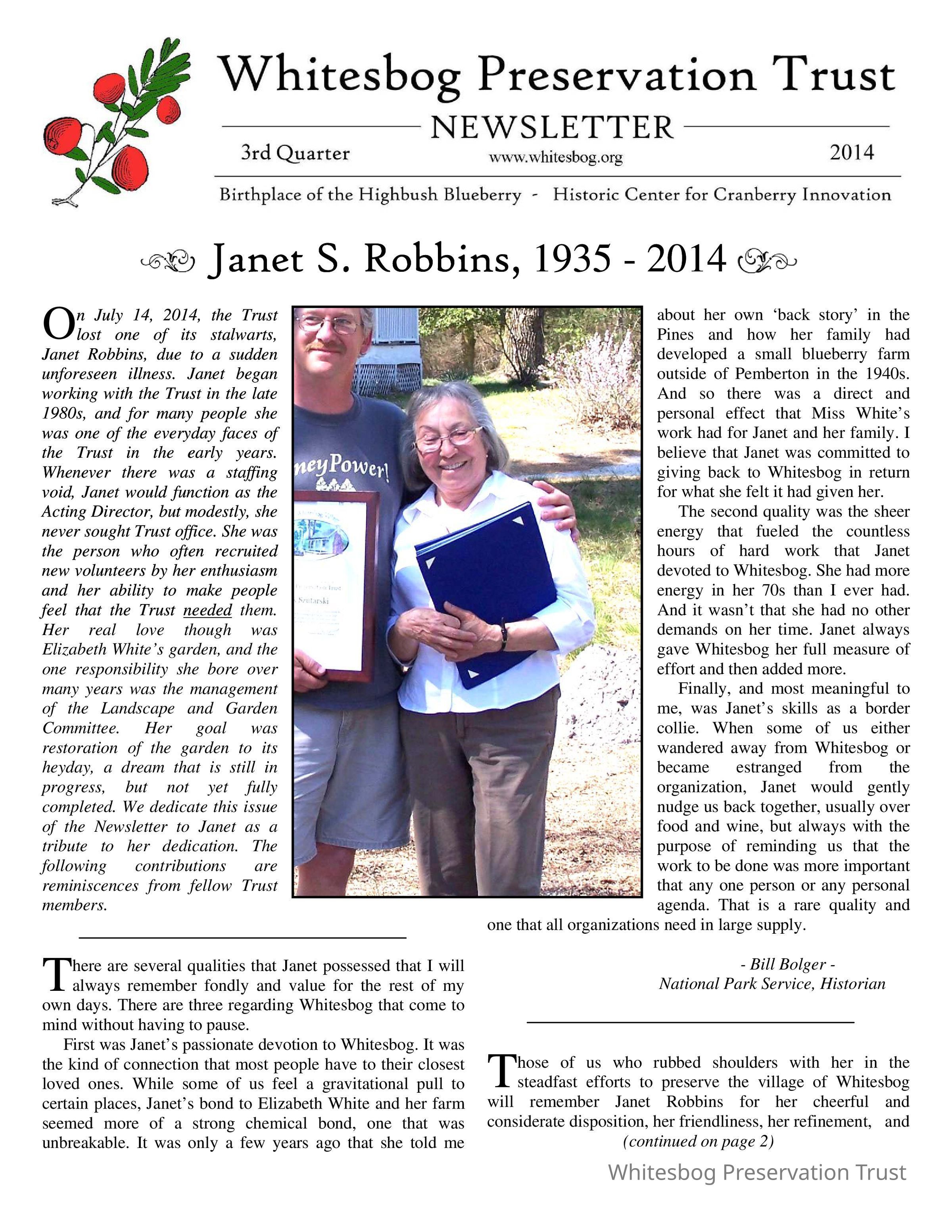 This issue pays tribute to Janet Robbins, a dedicated Whitesbog volunteer, and friend to all who knew her.