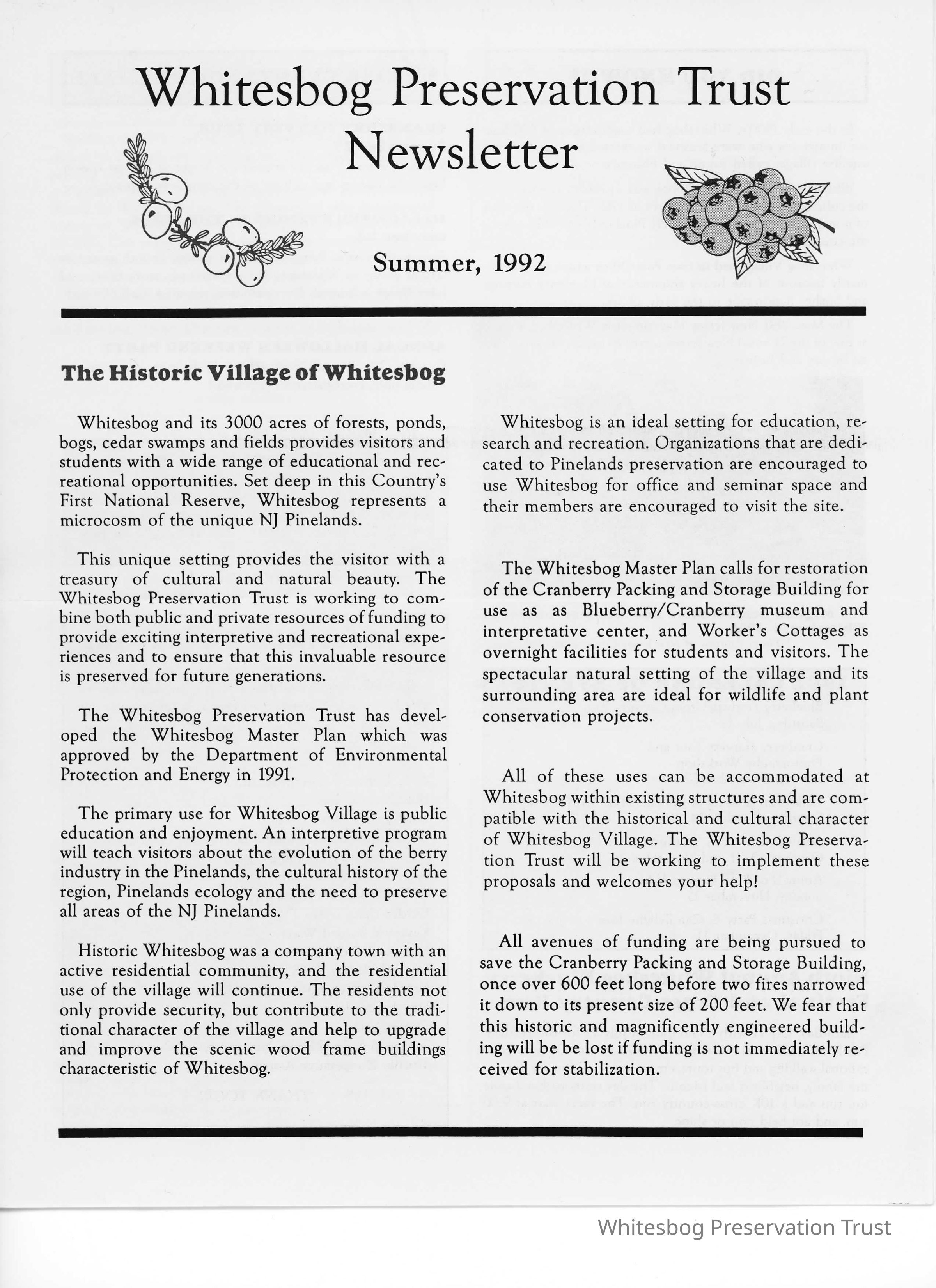 This newsletter discusses the "Whitesbog Master Plan" which was approved by the Department of Environmental Protection and Energy in 1991. It introduces plans to use Whitesbog as a public space for educational purposes and upcoming events.
