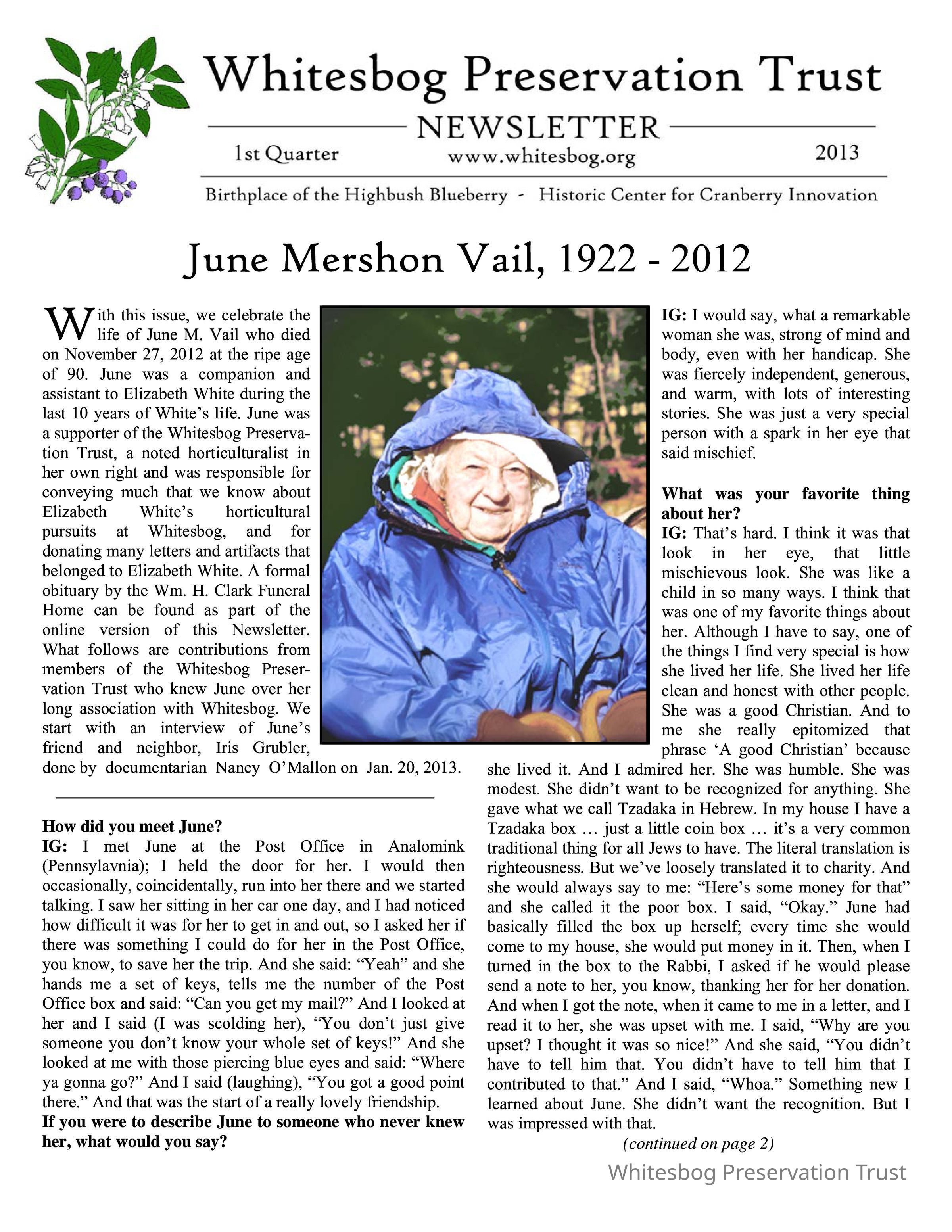 This issue celebrates the life of June Vail, companion and assistant to Elizabeth White, and features several Whitesbog Preservation Trust members paying tribute to Vail.