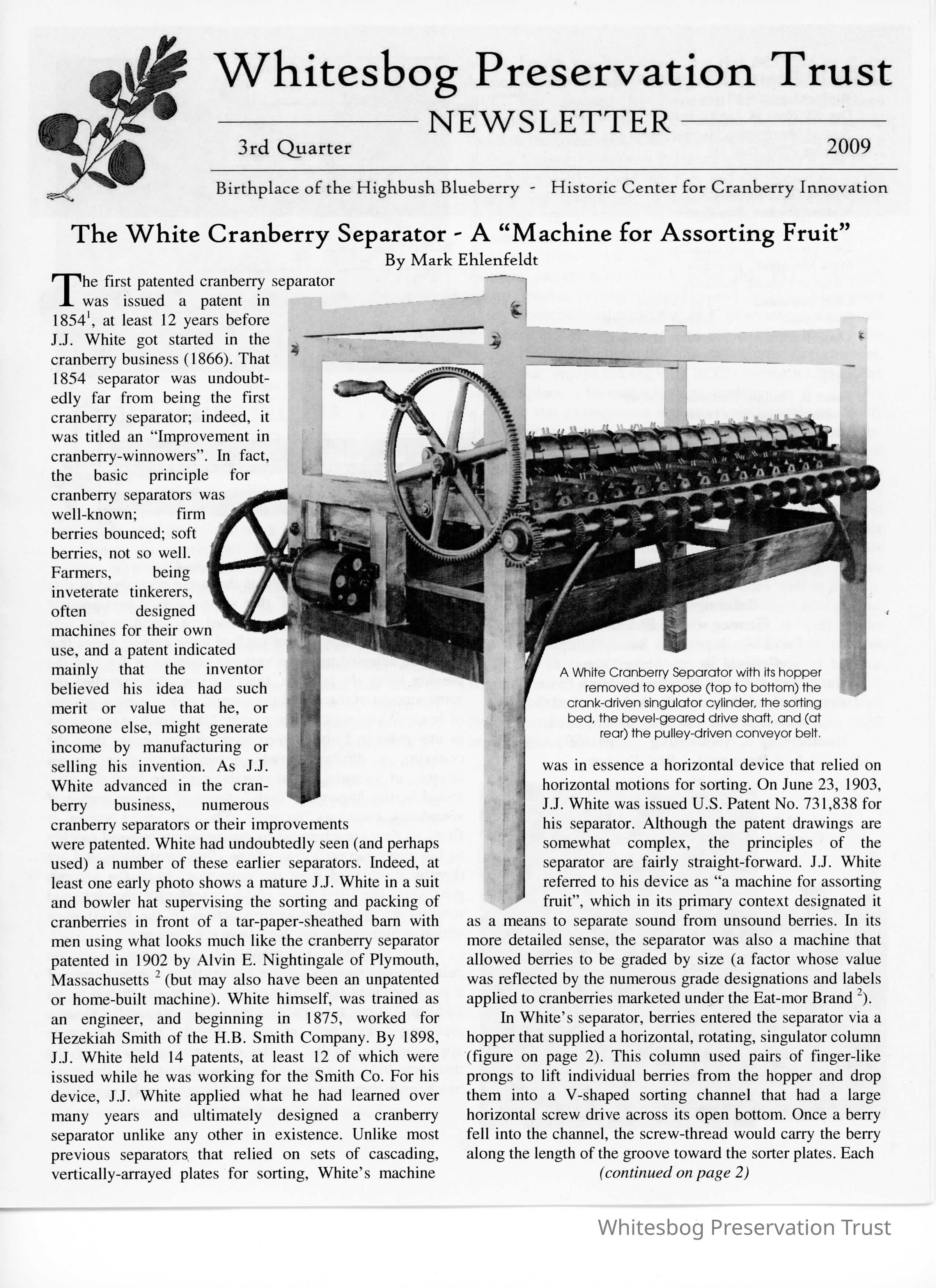 This issue provides information about the "White Cranberry Separator", its function and how it worked. While the machine did allow the berries to be separated by size, it was