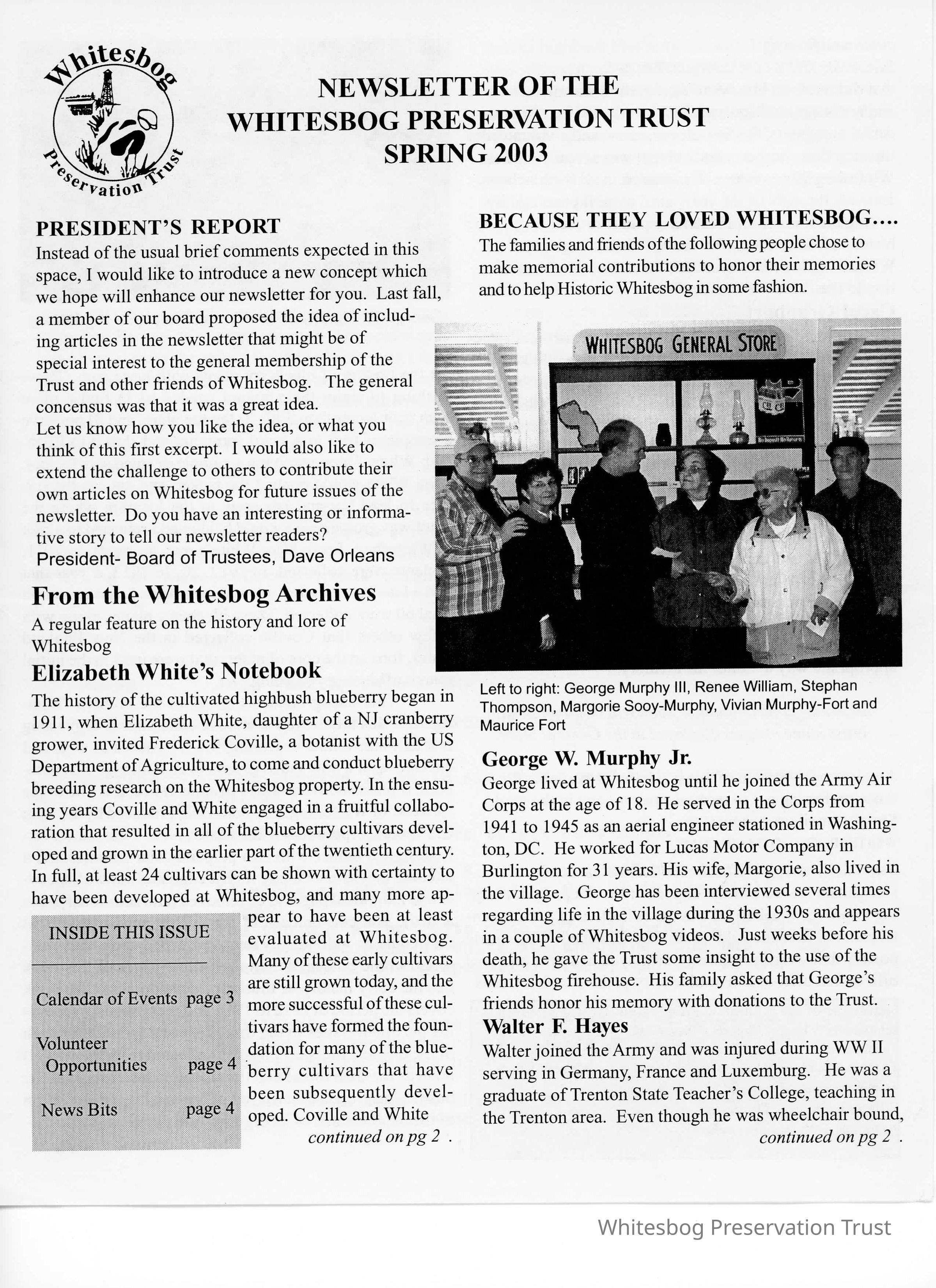 It also has an article tited "Because They Loved Whitesbog" in which contributions were made to Whitesbog in honor of people who worked at Whitesbog, to include George W. Murphy Jr, Walter F. Hayes, Carol Graubart, and Erwin E. Jakob Jr.