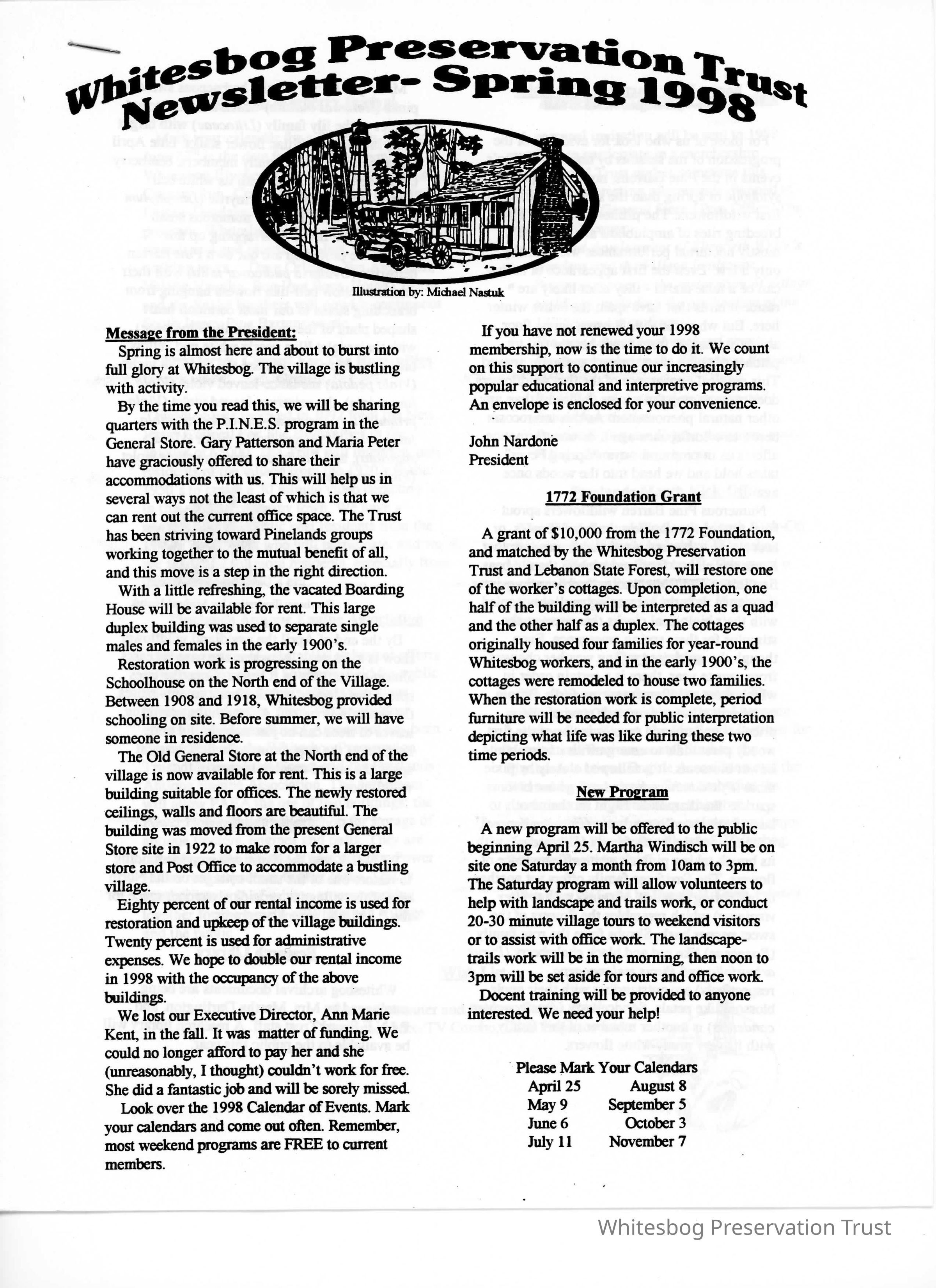 This newsletter includes information about how money is spent, Whitesbog receiving $10,000 from the 1772 Foundation, the wildflowers/plants one can see at Whitesbog, and an agreement with the Pinelands Antique Engine Association to work together.