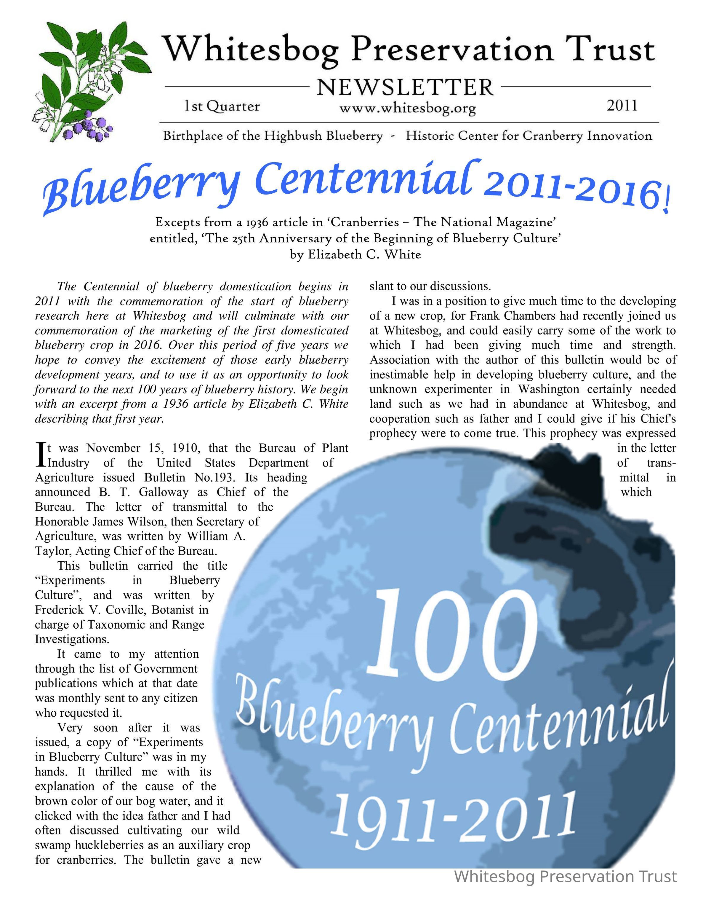 This issue features an article that kicks off recognition of the 100th anniversary of blueberry cultivation. It begins with an excerpt of an article written in 1936 by Elizabeth about the first year of blueberry development in 1911. This issue also includes the 2010 annual report of restoration and events at Whitesbog and their successes/progress.
