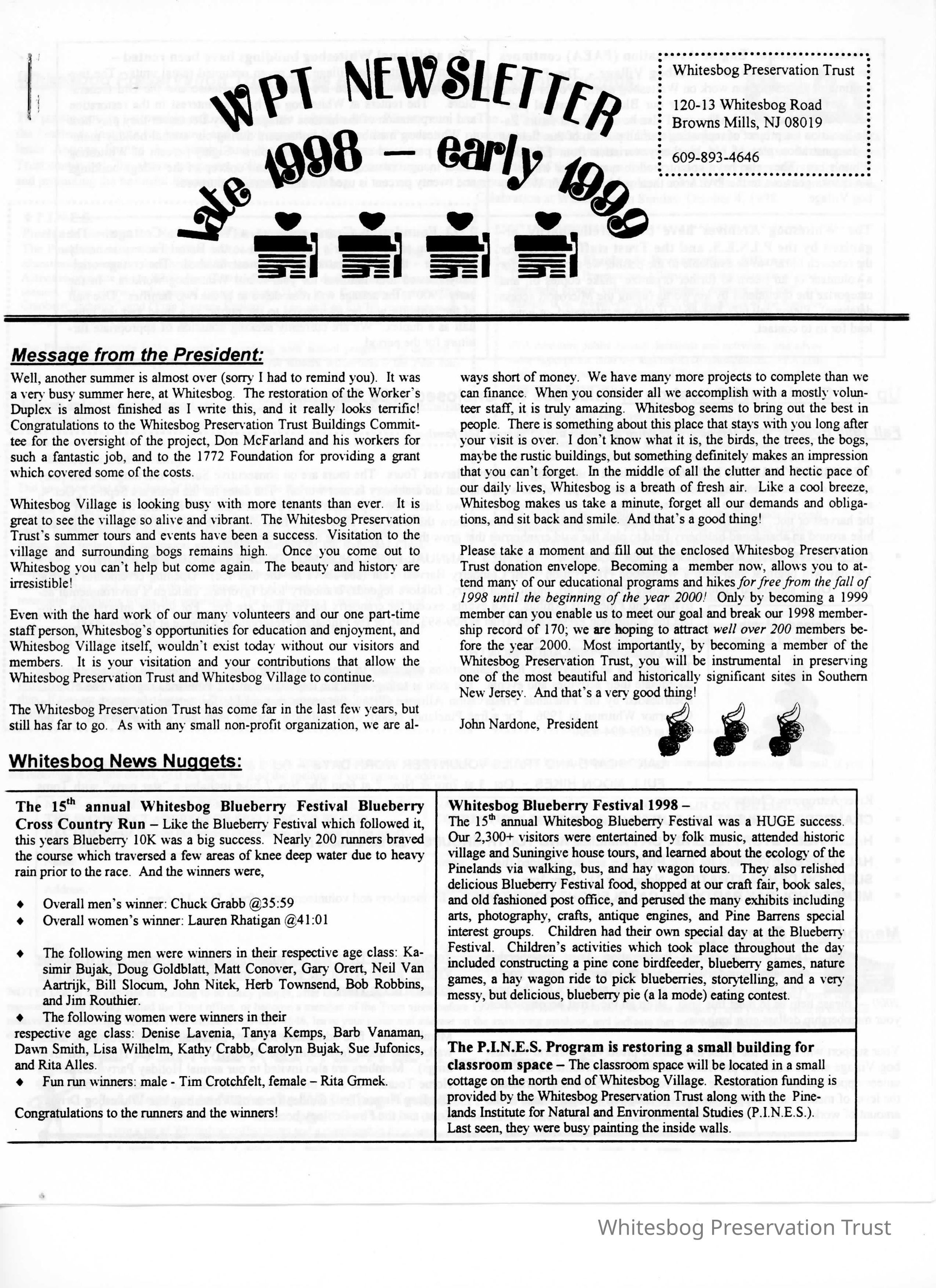 This newsletter outlines preservation projects, upcoming events, sights at Whitesbog in the fall, and a list of requested/needed items.