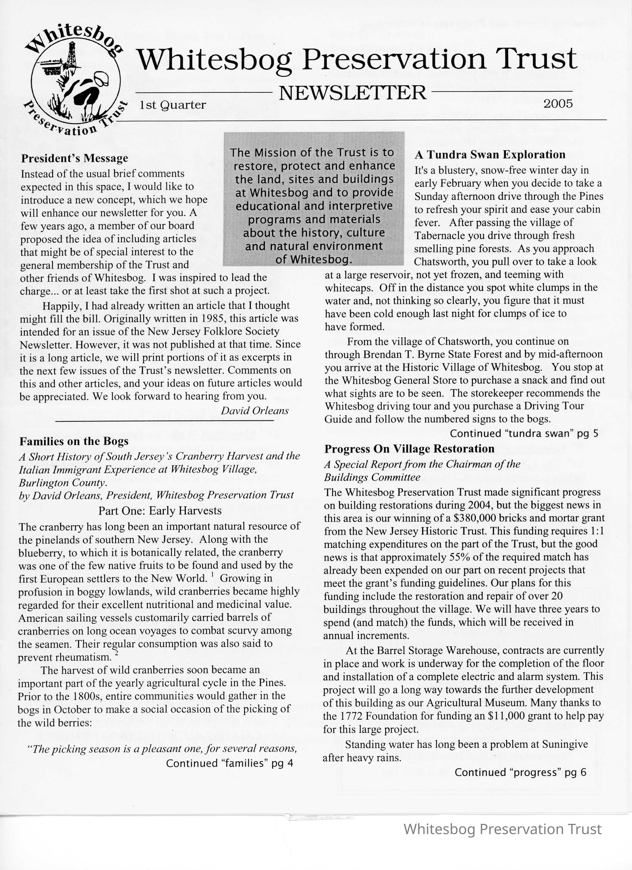 This issue of the newsletter features articles about the annual winter visit of the tundra swans and progress on building restoration that took place in 2004.