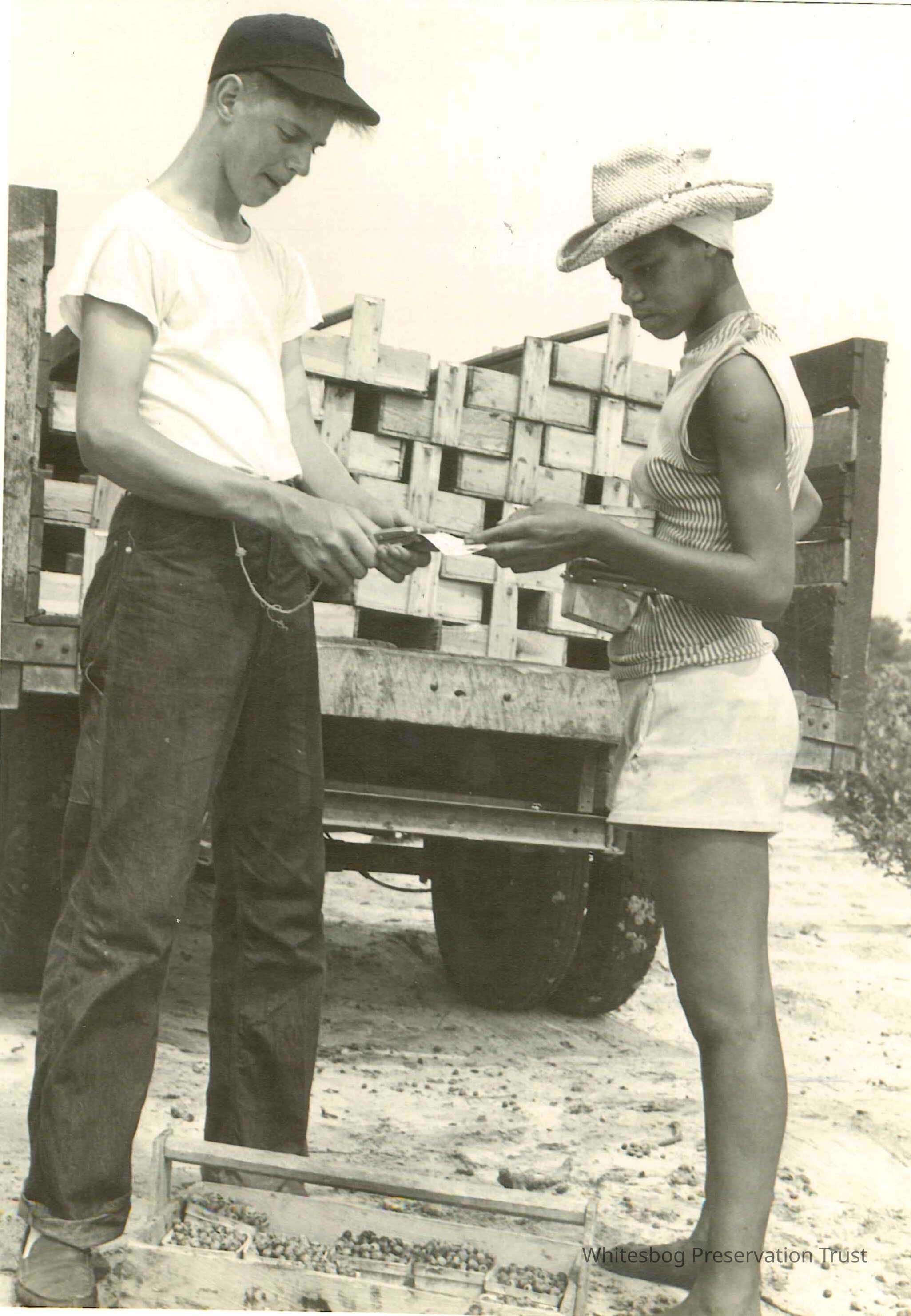 A young girl turning in blueberries to Fred Haines. Tally card is being punched. Truck with blueberries is in the background.Collection