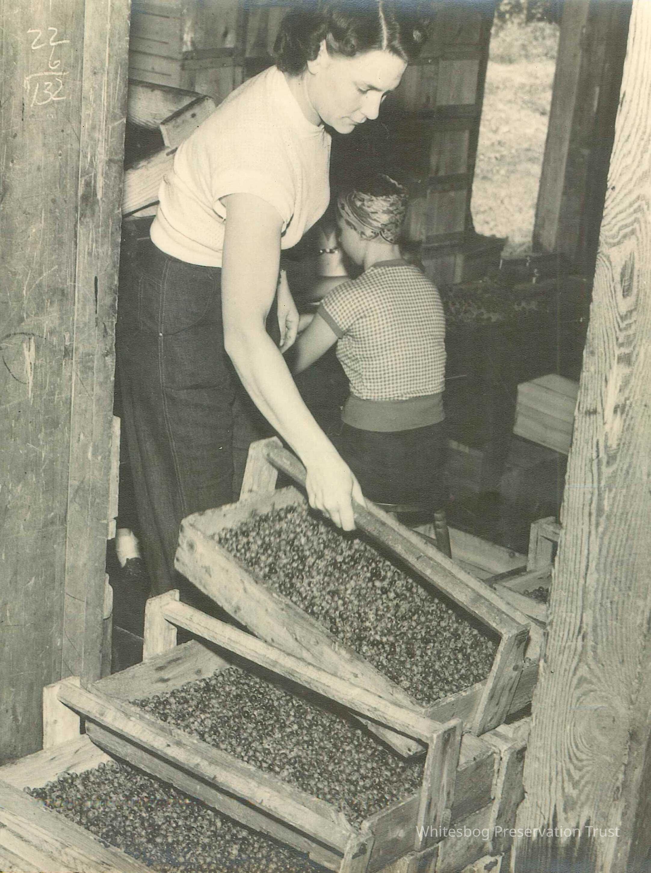 Woman in the forefront is Madeline West, and other woman with carrier boxes of blueberries. Blueberries being moved to sorting table.Collection