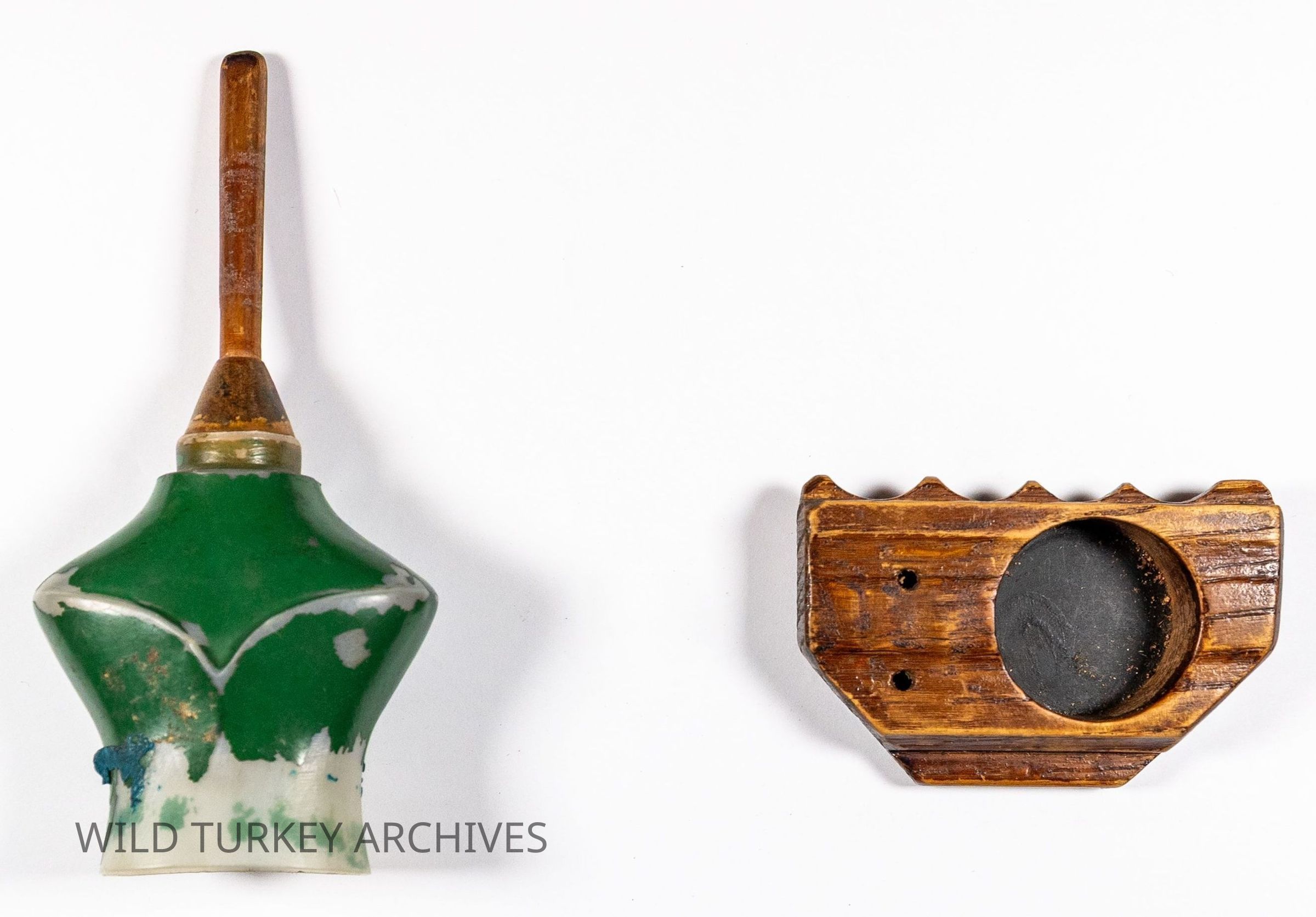 Ben Lee was an early ambassador of modern day turkey hunting and renowned for his turkey hunting and calling prowess. He developed a line of turkey calls, and this is a prototype of his Lee's Champion Slate Caller. The prototype features a pot with indentations for fingers, and the striker was the top of a Thrill brand soap bottle with a wooden dowel inserted. Green paint was appiled to the soap bottle portion. This prototype was given by Lee to his employee and Prostaffer, Tom Stuckey, for field testing.Collection