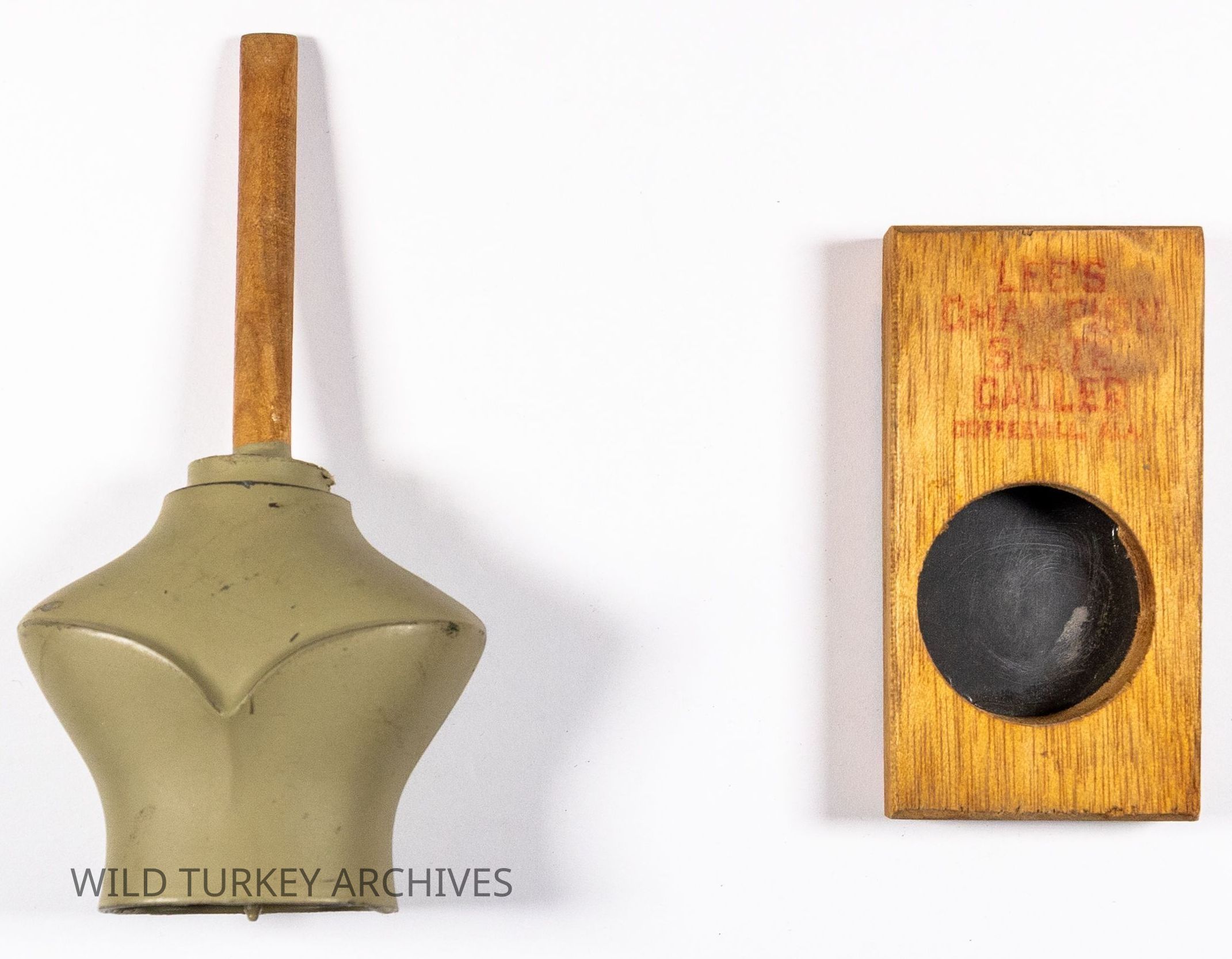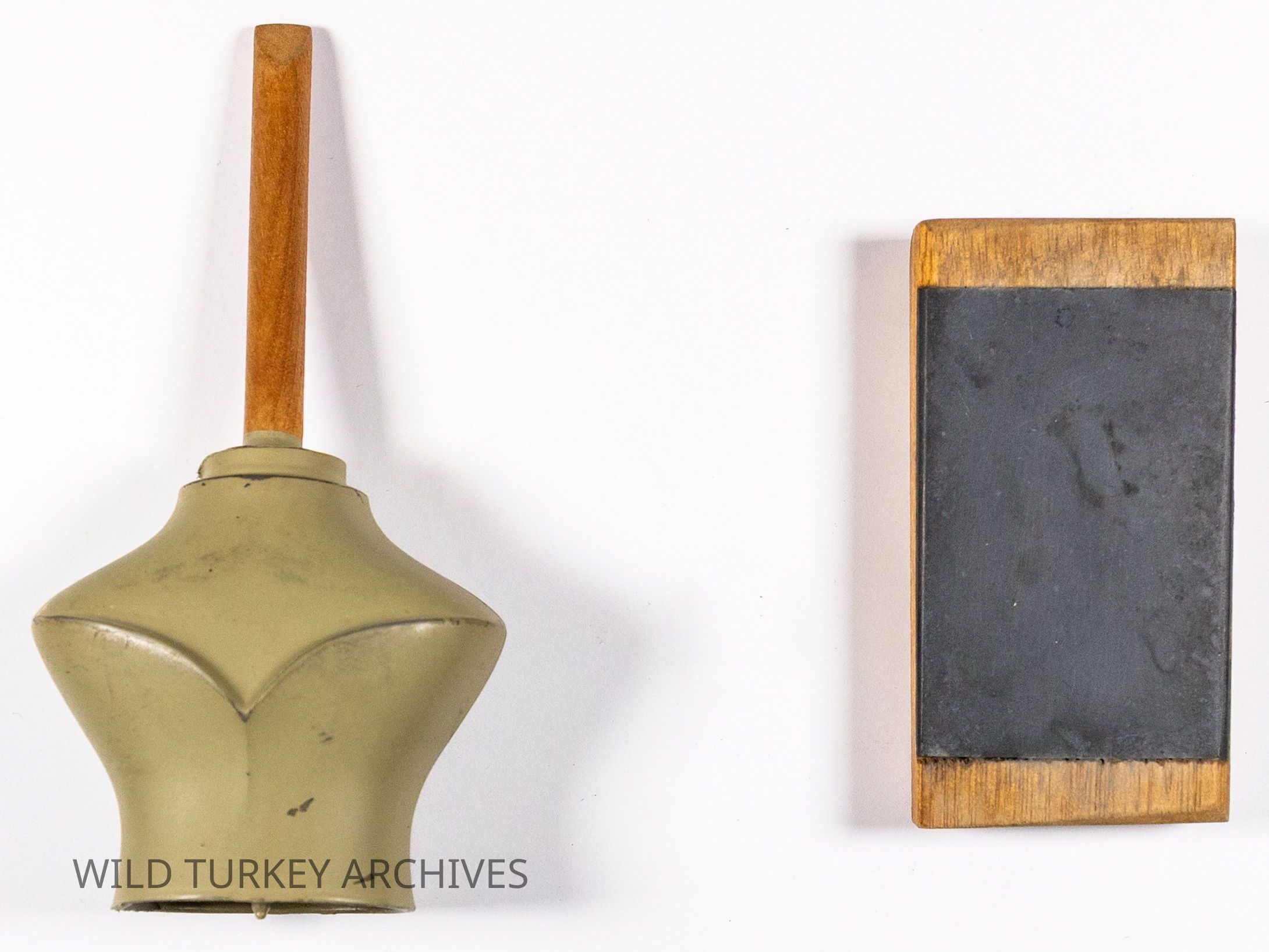 Ben Lee was an early ambassador of modern-day turkey hunting and was renowned for his turkey hunting and calling prowess. He developed a line of turkey calls, and this a production model of his Lee's Champion Slate Caller. It features a rectangular pot with a slate on one side and a hole to create a resonant sound chamber on the other. The striker was the top of a Thrill brand soap bottle with a wooden dowel inserted. Green paint was applied to the soap bottle portion.Collection