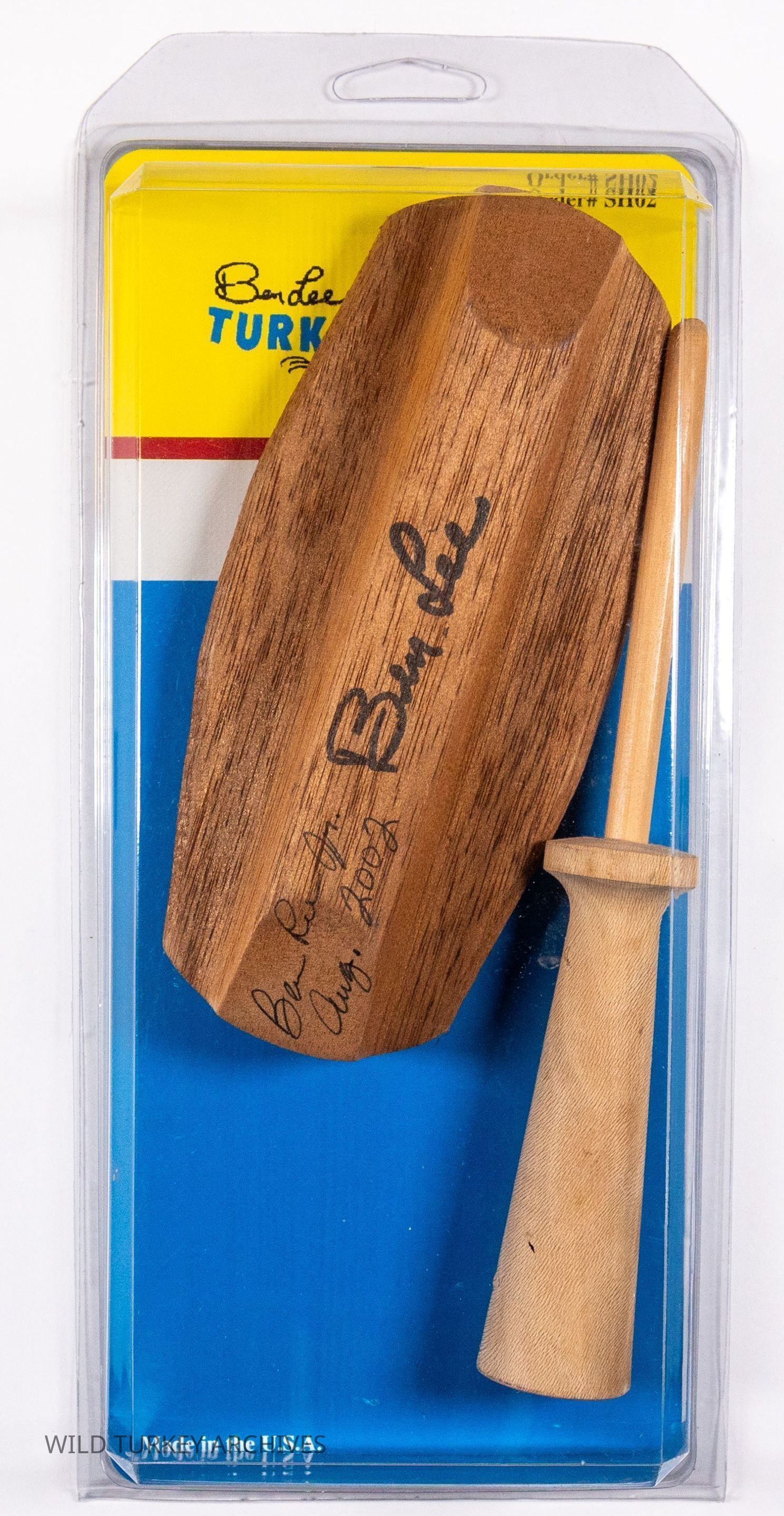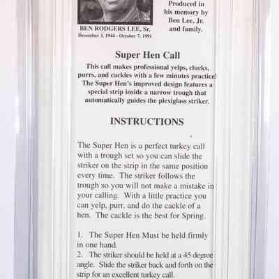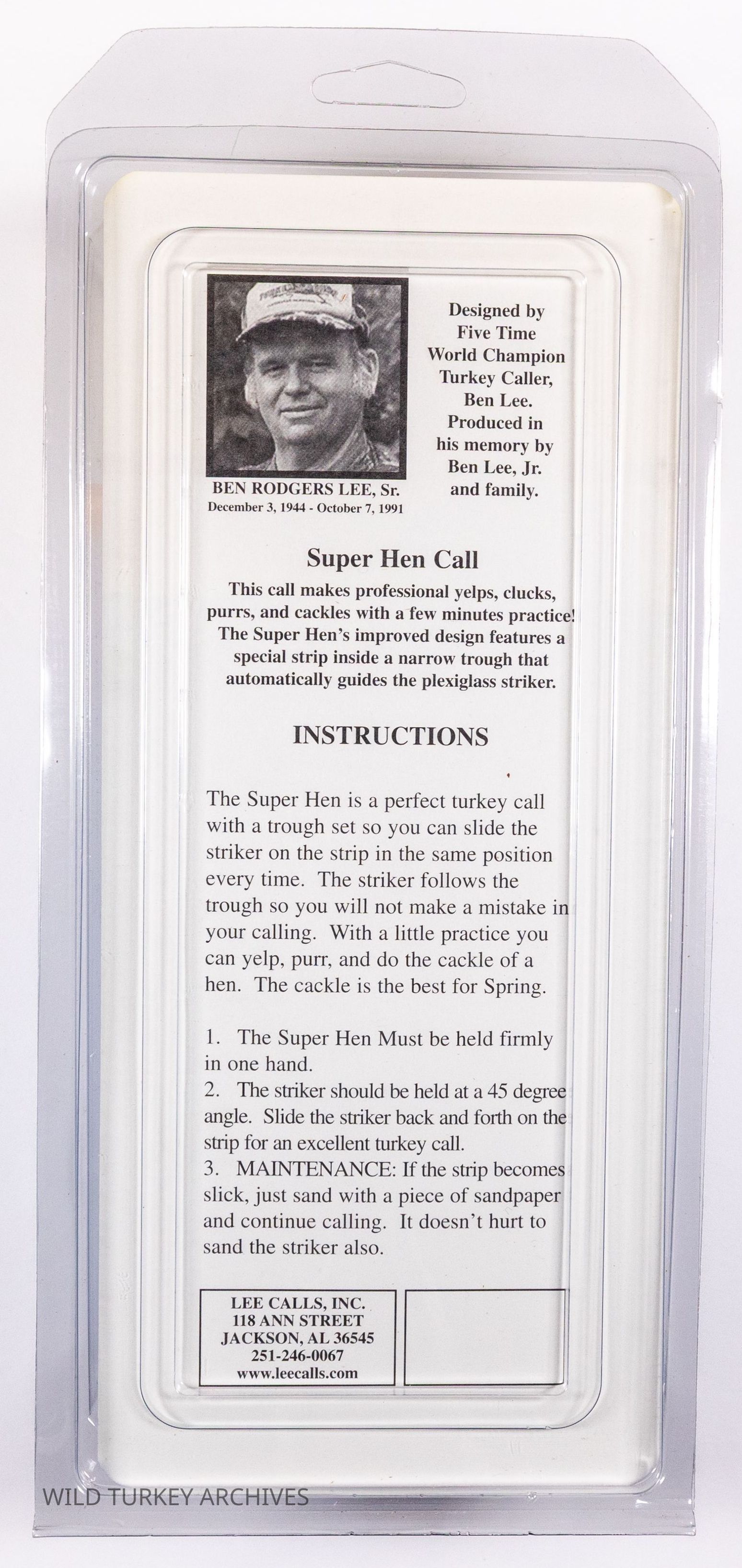 Ben Lee was an early ambassador of modern day turkey hunting and renowned for his turkey hunting and calling prowess. He developed a line of turkey calls and products. He adapted the trough-style call from Ray Chisholm with this call he dubbed the Super Hen. It had an aluminum strip in the trough, and a striker provided with the call. This model SH02 was made after Ben Lee's death by his son, Ben Lee, Jr. and sold under the Ben Lee's Turkey Shop brand.Collection