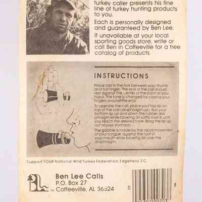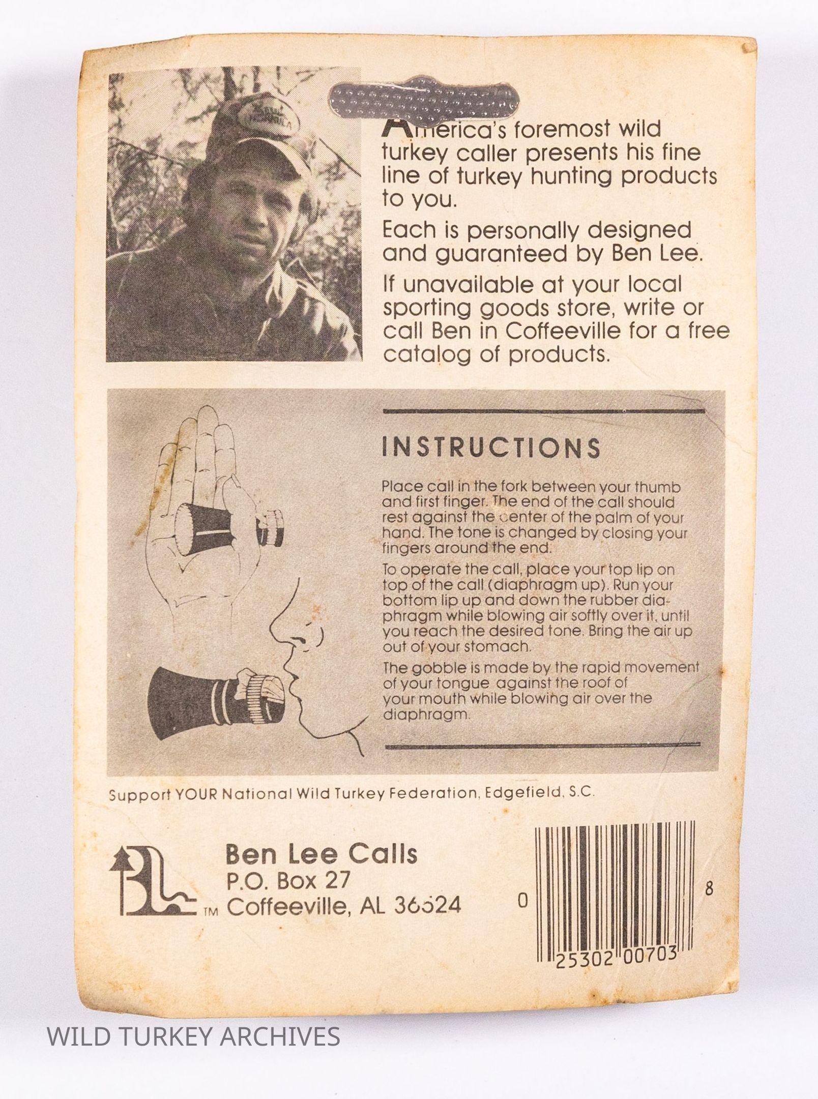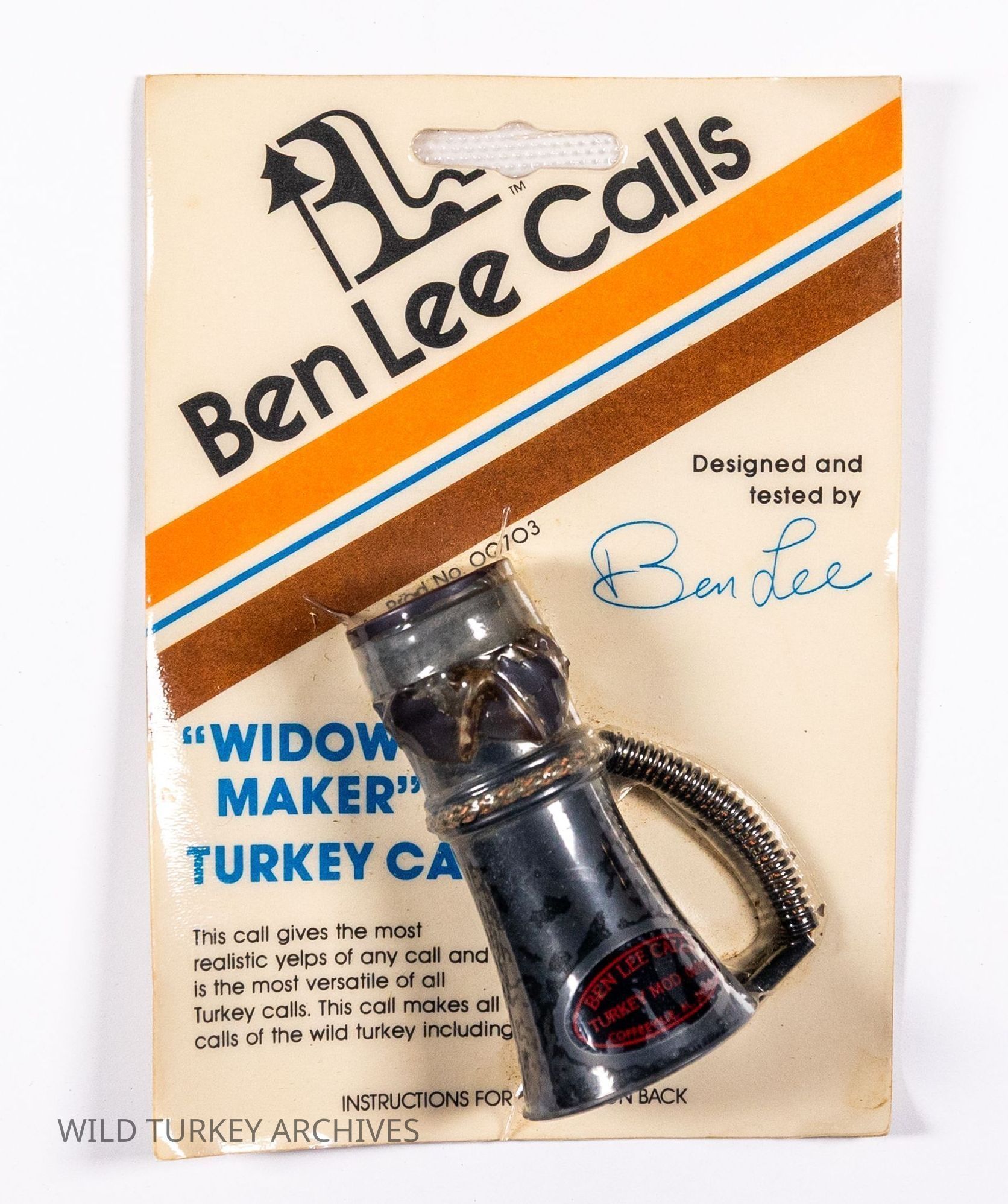 Ben Lee Calls was one of the company names used by Lee for his hunting call and product business prior to being acquired by Wellington Outdoors. One popular call was the Ben Lee "Widow Maker" Turkey Call. This model has a cylindrical bell (as opposed to a later "cow bell" style with a squared bell). It came equipped with a lanyard. It was Model 00703.Collection