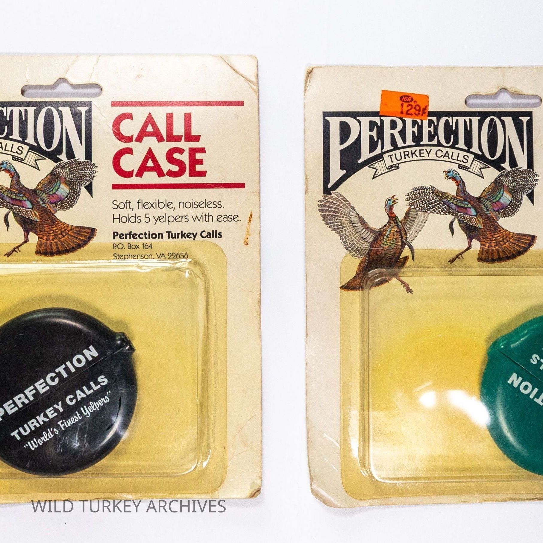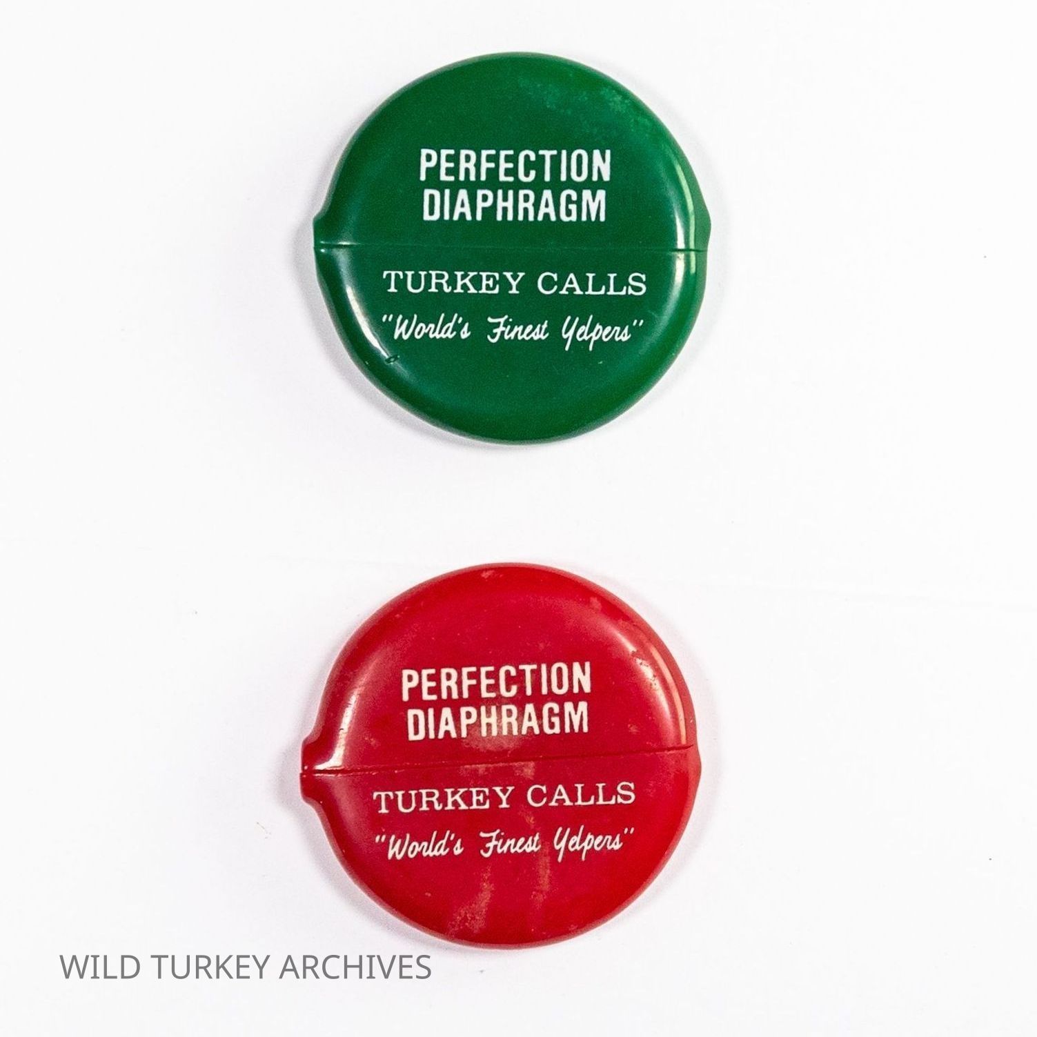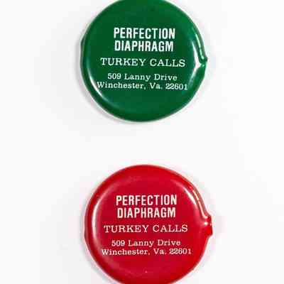 Diaphragm calls were a major seller for Perfection Turkey Calls. Just as many other production turkey call companies did, they offered a diaphragm call carrying case. The most common was the "coin purse" format, a rubber case that could be squeezed to reveal a central opening for coins or turkey calls. It was offered in different colors and shapes. Pictured are the round cases, which were offered (at least) in green, red, and black.Collection