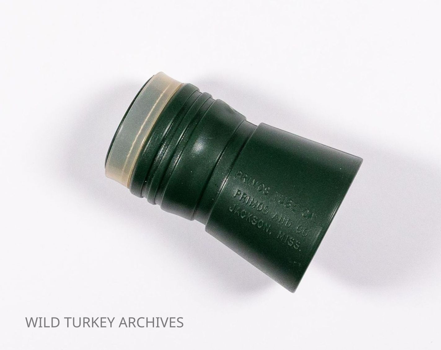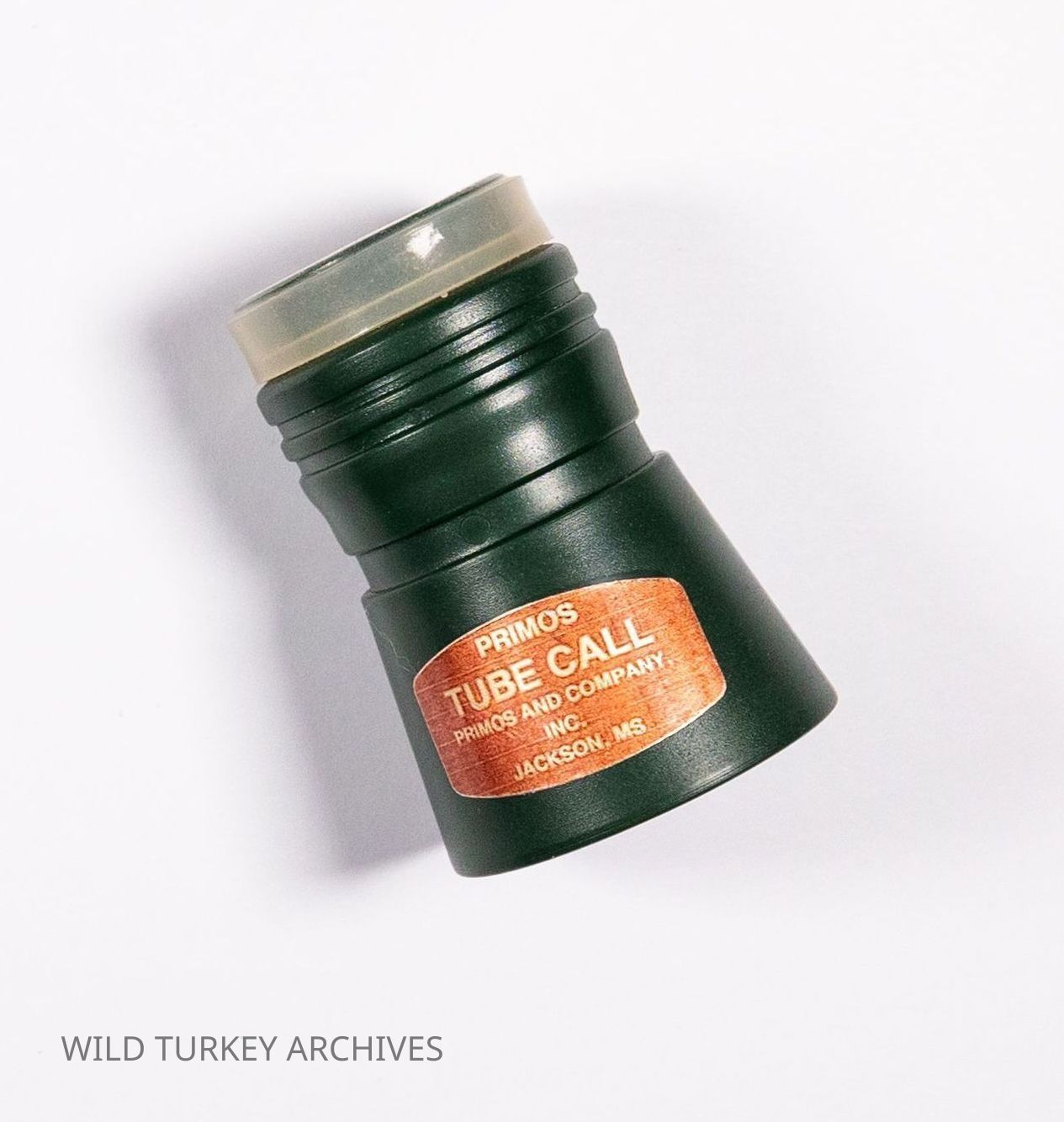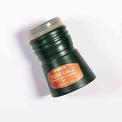 When Will Primos launched his company in 1976, the first name was Primos Yelpers, Inc. During the early to mid 1980s, the company would change names multiple times as it evolved. After PRIMOS YELPERS, INC. and PRIMOS, INC., PRIMOS & COMPANY would be the company's identity, even if only briefly. During this period, Will would design and launch tube calls in his line of calls. While he originally hunted with (and sold through his catalog) a Kenny Morgan tube call, he would have wooden and plastic tube calls specifically designed for Primos. This is an early Primos Tube Call, made of green plastic. This model still has the original bronze sticker. The sticker as well as the tube itself bear the Jackson, MS location which was the original location of the company.Collection