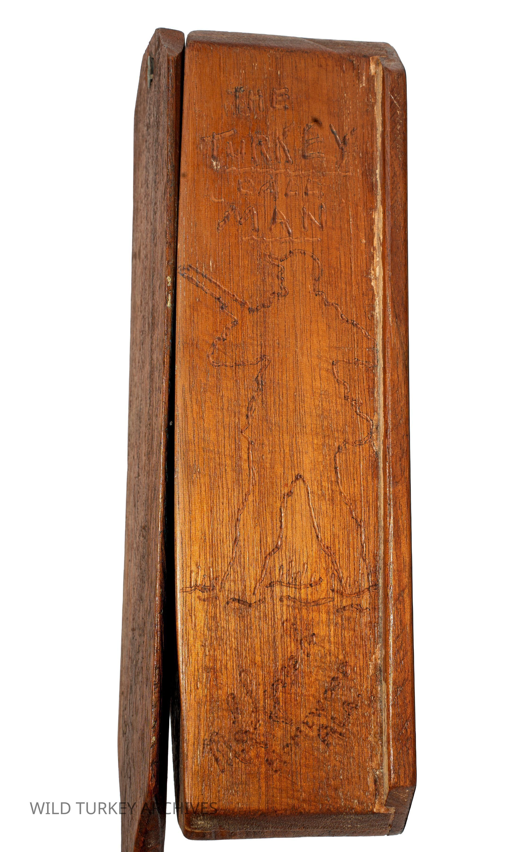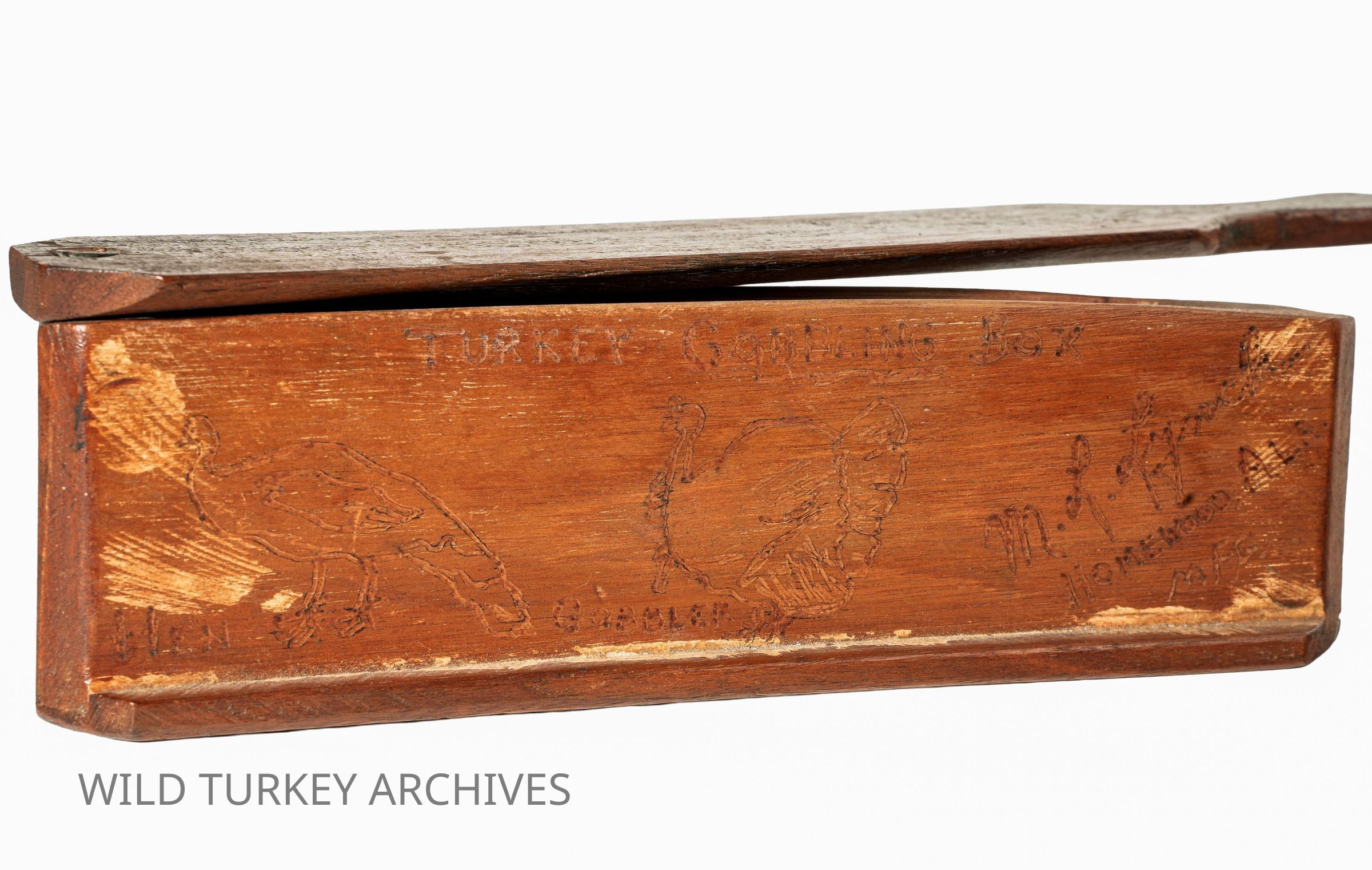 M.L. Lynch is a turkey callmaking titan. His was the first significantly successful nationwide distribution of calls. He started his callmaking around 1940 from his home in Homewood, Alabama. His "Homewood calls" are cornerstones of any collection. While typical Homewood calls of sound provenance are of one-piece box body construction, there are at least two known Homewood “Gobble Boxes” that are sawn-and-glued. These would be predecessors of his World Champion box calls. His Homewood calls are also known for their decorative quality, with Lynch's name, "M.L. Lynch," always appearing, as well as some other wording or imagery. The Gobbling Boxes (or Gobble Boxes) have an image of a turkey hunter. Note that in the one pictured, "The Turkey Call Man" is carved into the box. Another telltale sign of a sawn-and-glued M.L. Lynch box is in the excess glue residue, for which this example has aplenty!Collection