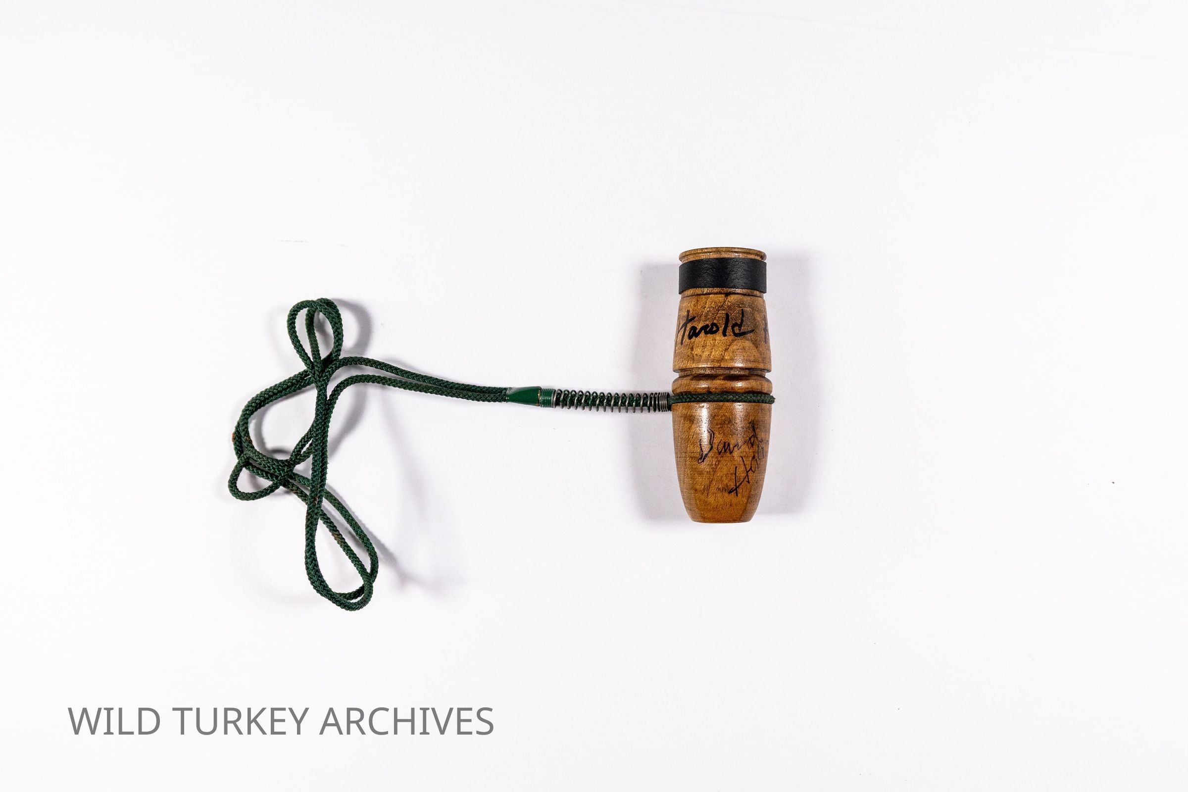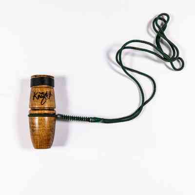 After making tube calls with PVC cylinders and pill bottles, Harold Knight continued experimenting with his design, and in 1975, Knight & Hale began to make some wooden tube goose calls. Jack Thomas made all of the early wooden tubes, and Knight glued in the lip stops and applied all the finish. Few woods were used, with walnut being the most common. The pictured call does not have grooving (decorative "rings") on the bell, indicating that it is one of the early one-piece wooden tubes. It also has a green lanyard. That story is fully told in Yelp & Gobble, Inc. by Brent Rogers. The first handmade lanyards they made, before purchasing machine crimping units, were all handmade by David Hale and painted with green John-Deere paint by Eric Mitchell; hence, they refer to the green lanyard pictured as “the John Deere lanyards.” Some of the one-piece tubes had slightly curved bells (barrel-shaped, as pictured), while others had a more straight taper. In 1973-1974, several hundred of these wooden one-piece (hand-turned on a lathe and then drilled out) calls were made from walnut or cherry, and perhaps fewer than thirty from maple; other woods were uncommon.Collection
