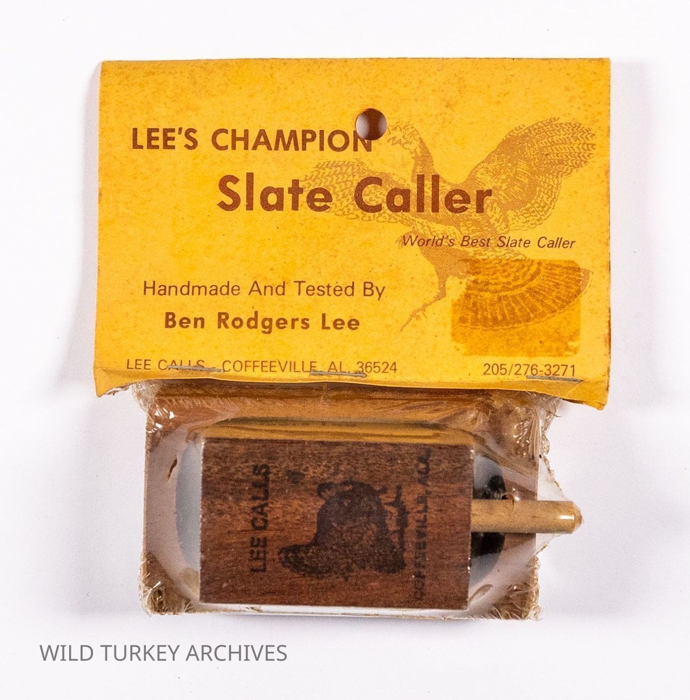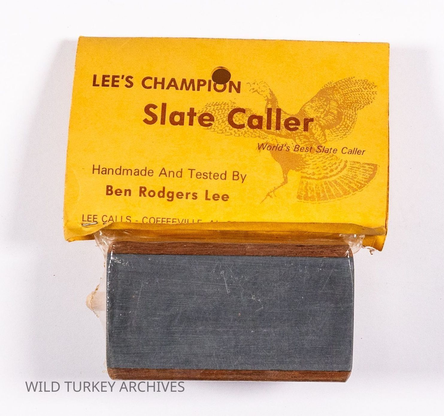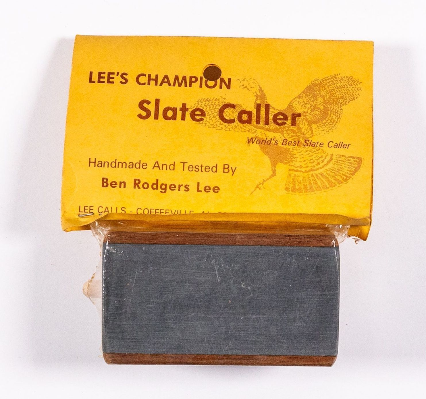 Ben Lee developed a line of turkey calls and products after achieving recognition for his competitive calling and promotion of modern turkey hunting. He had more than one version of his "Champion Slate Caller," with this one resembling the M.L. Lynch jet slate, and William Tannehill's call (patented in 1960). This model featured a slate surface mounted in a rectangular wooden "pot" and was paired with a striker composed of a squared wooden head with a wood dowel inserted.Collection