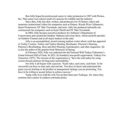 Memories of Spring was published in 2020 by Jolly's Outdoor Visions, LLC. The author Ron Jolly teamed up with his wife, Tes Randell Jolly, whose amazing photography is used throughout the book, to bring the turkey-hunting world a piece of literature sure to become a classic. Jolly, a 2020 inductee into the National Wild Turkey Hall of Fame, is a well-known video producer who worked on Primos's The Truth Video series (Vol 2-8). He also produced numerous other videos for Primos from 1988 to 1996. After Primos, he and his wife would team up to produce videos for Woods Wise Products, Ol Man Treestands, and Quest Productions. Jolly is also well known for a 15 year run as producer of Outdoor Alabama and is an accomplished writer who has had articles published in numerous hunting publications. Memories of Spring draws on a lifetime of knowledge gained from years behind a camera and shotgun. Throughout the book, the author tells entertaining, informative stories that teach hunters without them even realizing they're learning. Stories full of wit and wisdom gained from decades of being a student of the wild turkey.Context